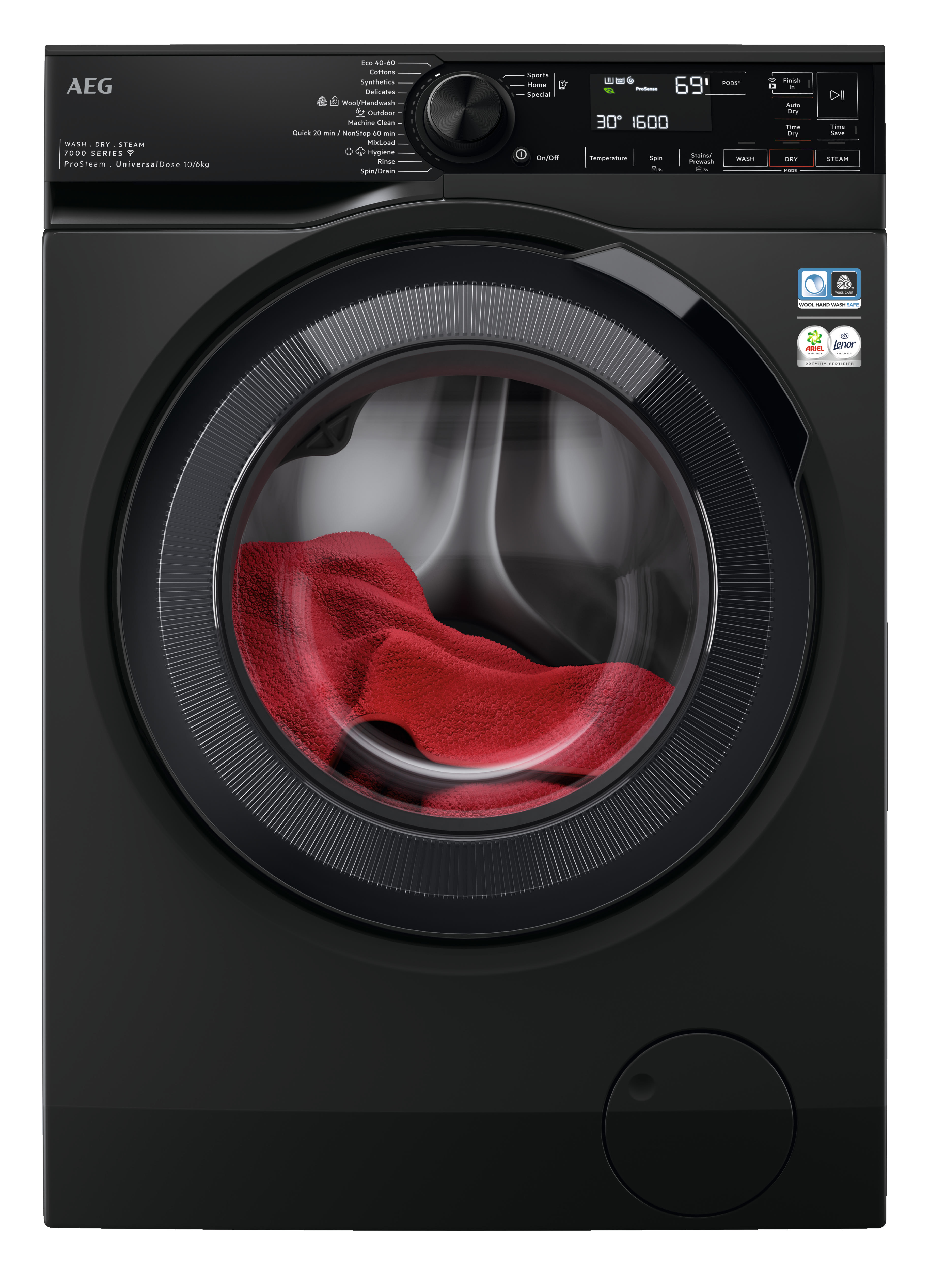 The AEG Freestanding Washer Dryer features a steam refresh function which freshens up lightly soiled clothes and gets rid of pesky wrinkles. It uses up to 96% less water and helps keep your ironing pile in check. The special care wash to dry cycle is certified, so you can trust it to look after your most delicate items. And the unique universal dose drawer uses special water jets to pierce, soften and dissolve pods capsules so they activate 60% faster. It gives your daily washes some extra oomph to combat stubborn stains.