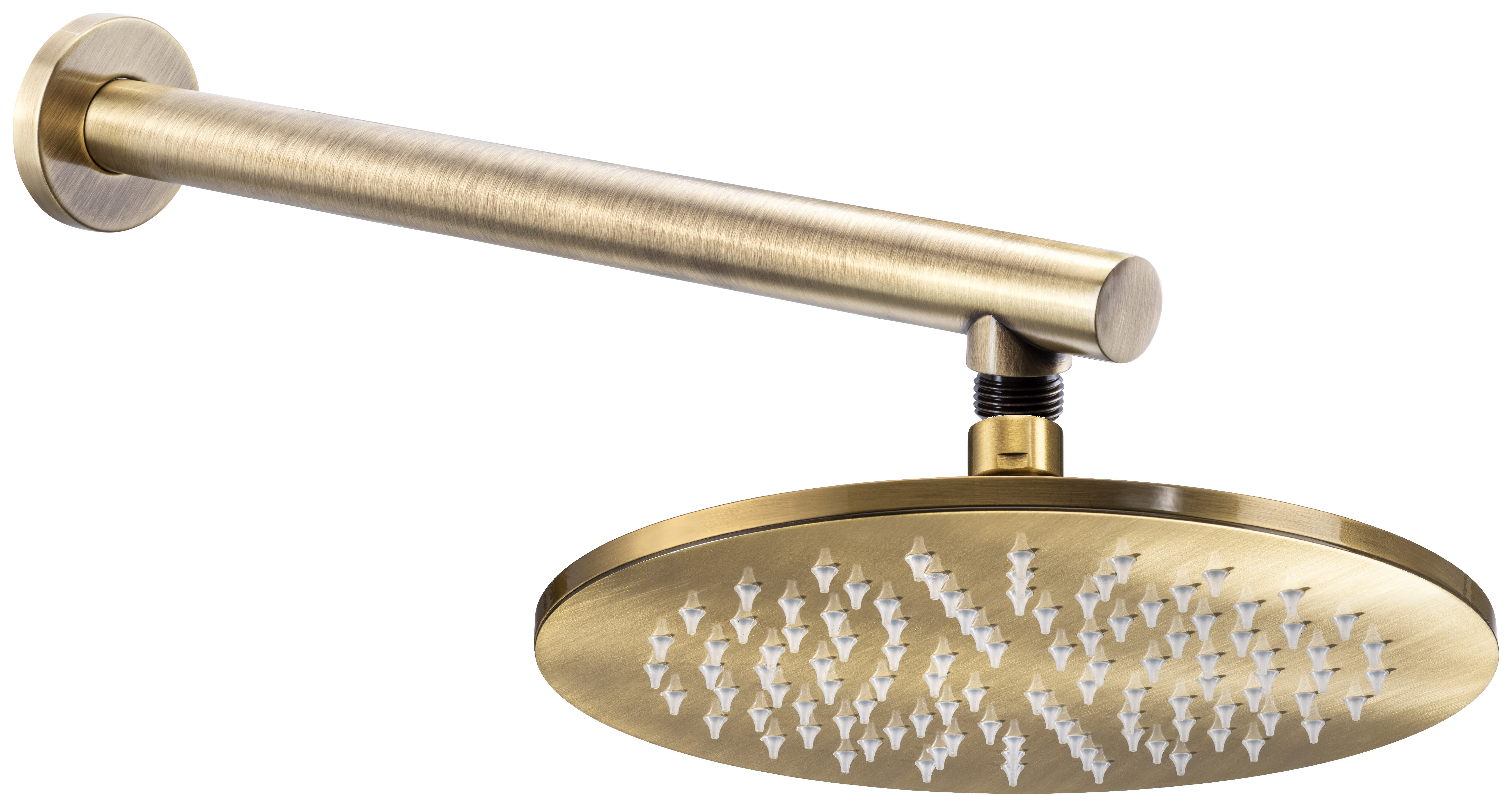 Abode Storm Antique Brass Wall Mounted Round Shower Head & Arm - 225mm