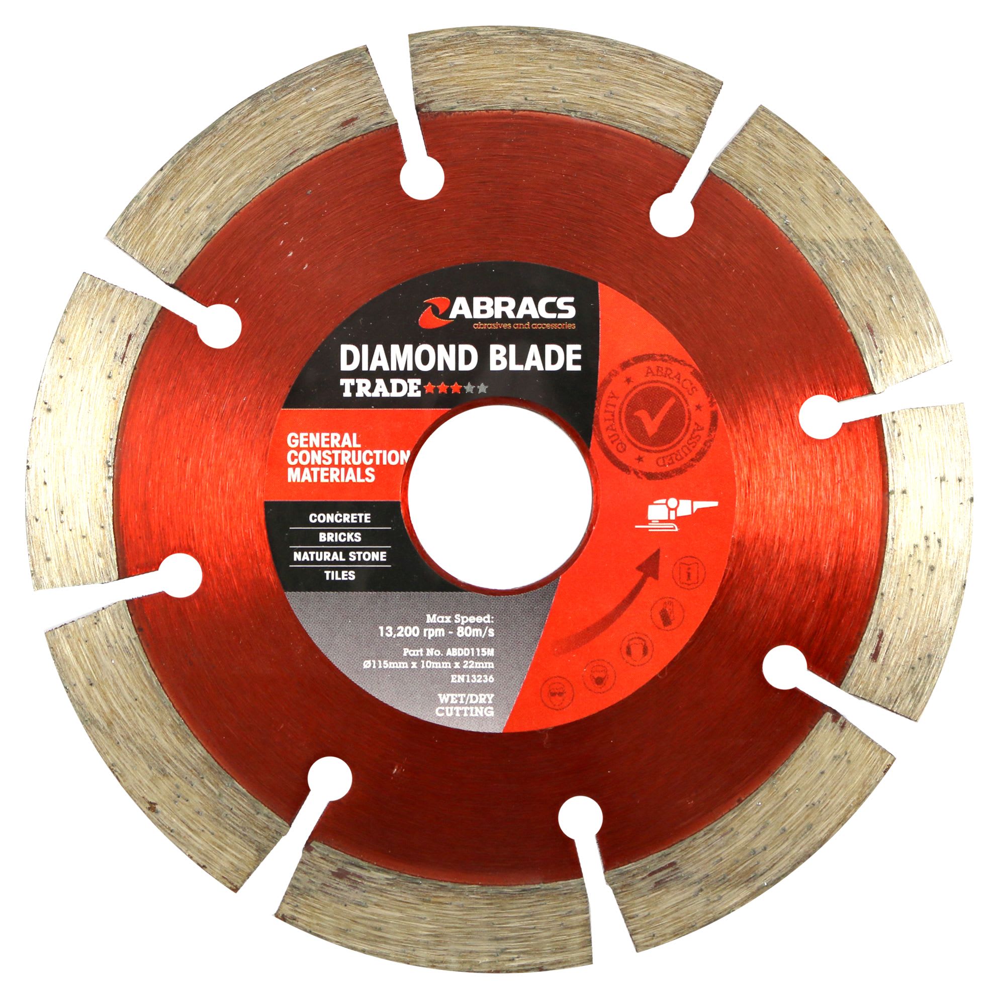 The Abracs GP ABDD115M Diamond Segmented Blades are suitable for a variety of building materials. With a 10mm segment for increased lifespan this entry level professional combination blade has been designed to offer excellent value for money with a good cost per cut ratio. Key hole gullets to aid stock removal and clear debris from the cutting surface.