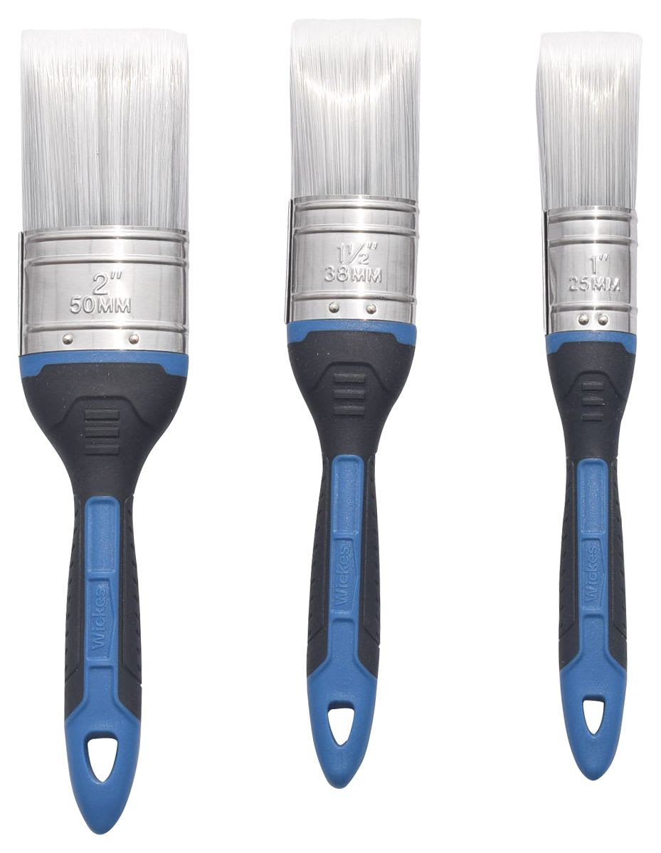 A pack of 3 all purpose paint brushes soft grip handles for comfortable use, and quality synthetic bristles for even paint application.