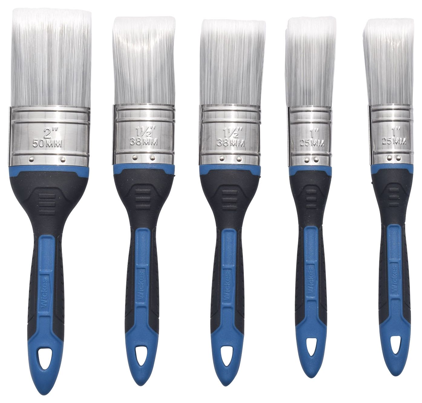 A pack of 5 all purpose paint brushes soft grip handles for comfortable use, and quality synthetic bristles for even paint application.