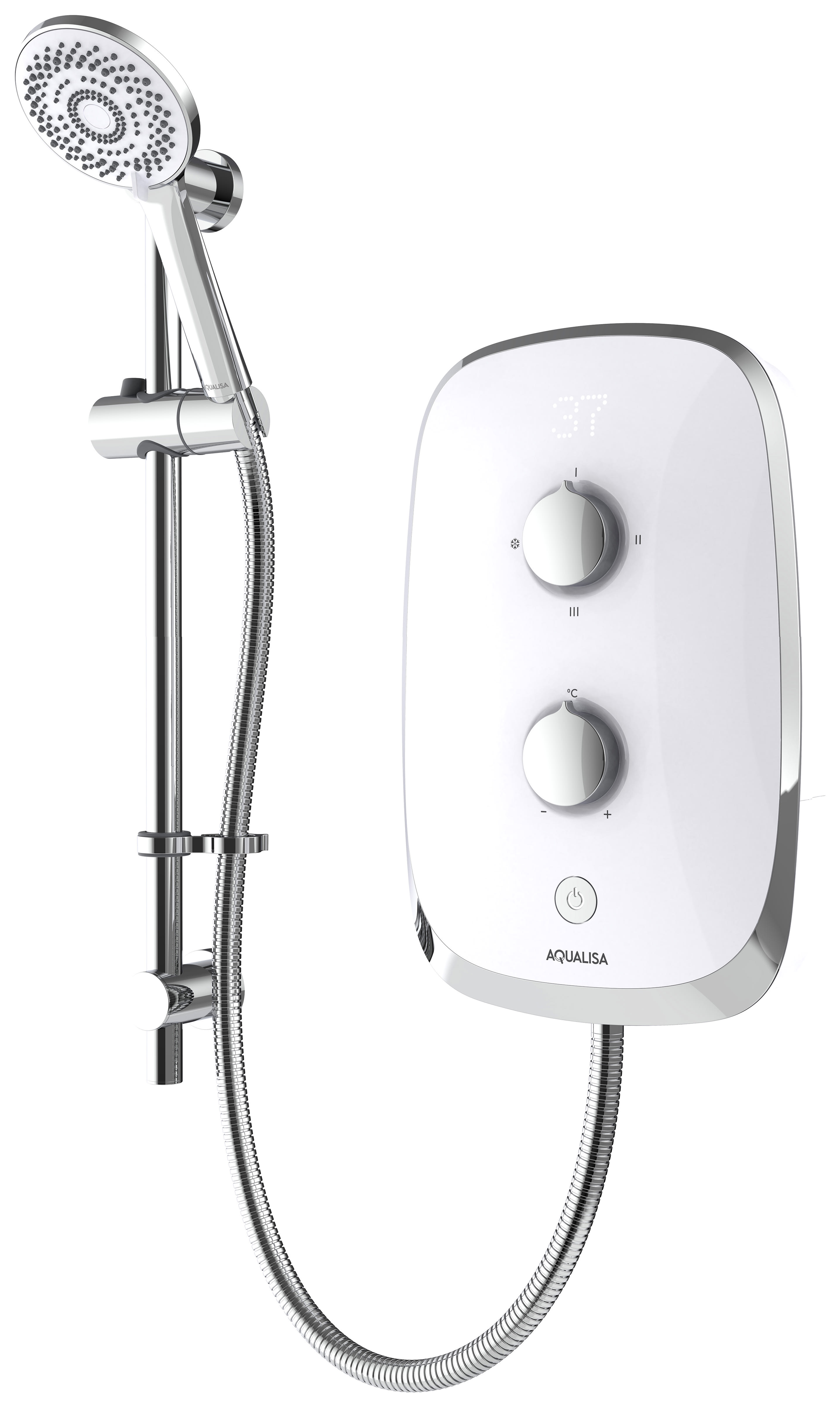 In brilliant arctic white and chrome, with a contoured, polished chrome trim, the streamlined Aqualisa eMOTION 9.5kW electric shower has unmistakeable style appeal and all round quality. Design, detail and superb installation flexibility make it the perfect solution for showering on demand. Retrofitable for most electric shower units, the 8 multi-fit connection options make upgrades and replacements problem free. Multiple power settings and a 3 spray pattern showerhead give plenty of showering choices in terms of force and coverage. A separate temperature control smoothly adjusts to the required level, which is digitally displayed and kept safe by the over temperature stop function. Automatic phased shutdown reduces limescale buildup for better performance and product durability. Supplied by mains cold water only, the higher rated 9.5kW model will require a dedicated electrical connection to the existing domestic supply (at 240V) and the unit, shower head and kit are fully guaranteed.