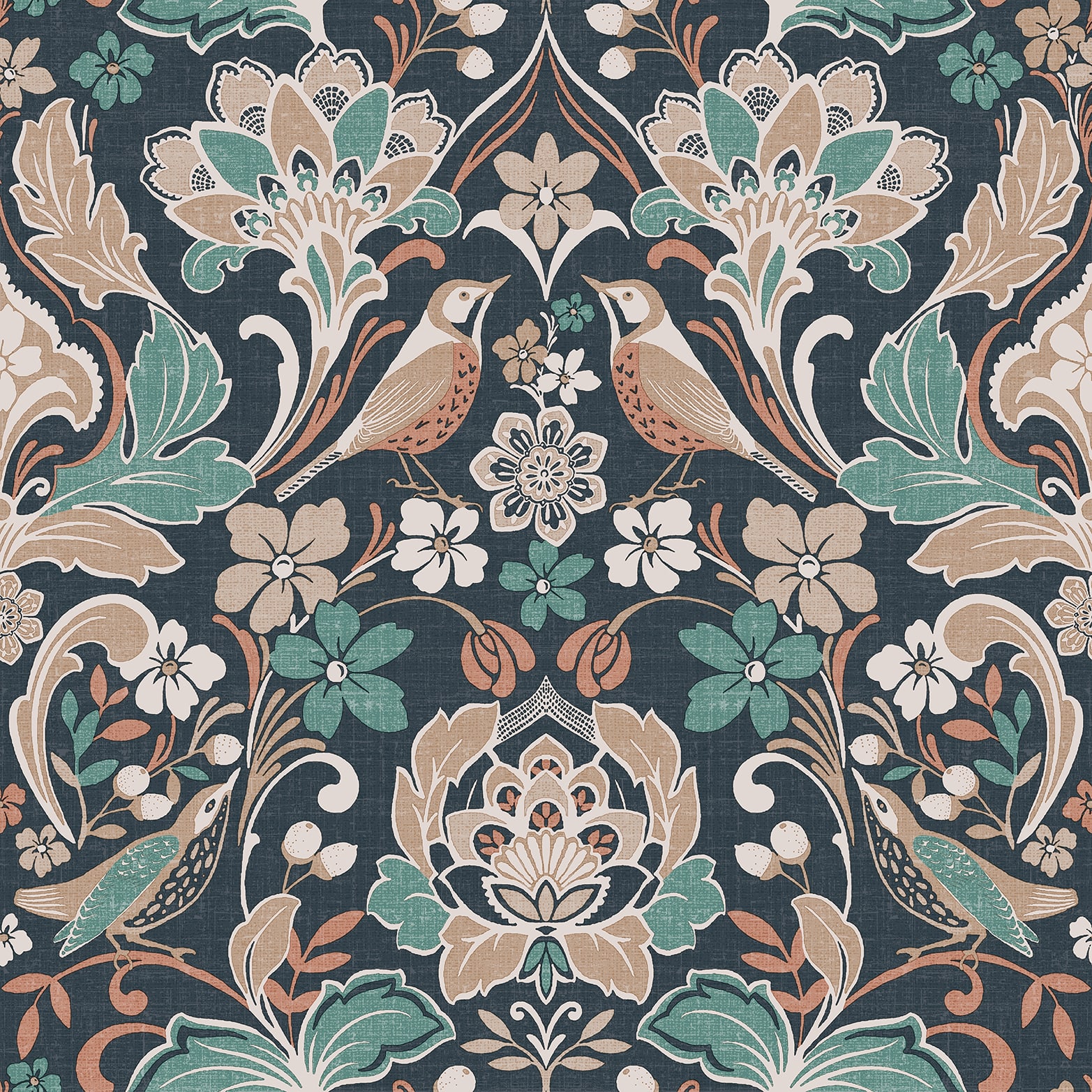 Enhance your space with the Folk Floral wallpaper in navy, where intricate patterns of birds and flowers come to life on a rich, navy background. This design adds a bold, vintage touch to any room, with detailed artwork that stands out beautifully against the dark backdrop. Whether used as a striking feature wall or to cover an entire room, this wallpaper brings a sense of depth and sophistication. Ideal for living rooms, bedrooms, or dining areas, it is suitable for most rooms except high moisture environments like bathrooms.