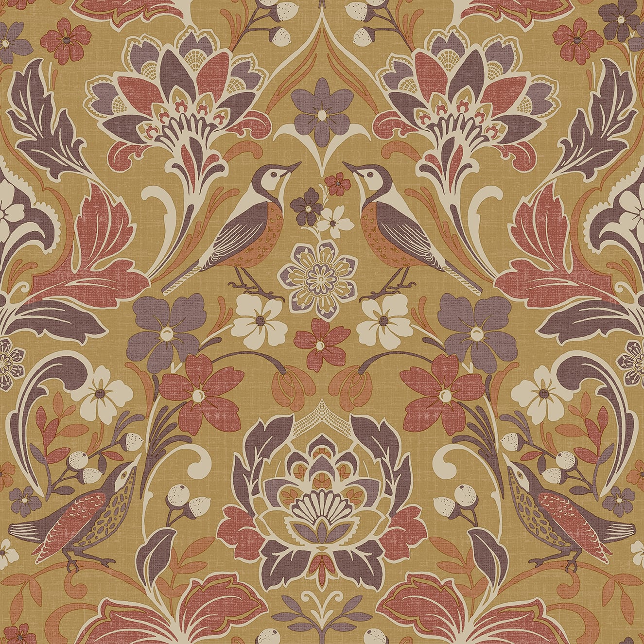 Bring warmth and charm to your home with the Folk Floral wallpaper in ochre. Featuring intricate patterns of birds and flowers, this design is set against a vibrant ochre background, adding a lively yet elegant feel to any room. The detailed artwork enhances the vintage appeal, making it a standout choice for any interior. Use this wallpaper to create a stunning feature wall or to envelop an entire room in its warm, inviting tones. Ideal for living rooms, bedrooms, or dining areas, it is suitable for most rooms except high moisture environments like bathrooms.
