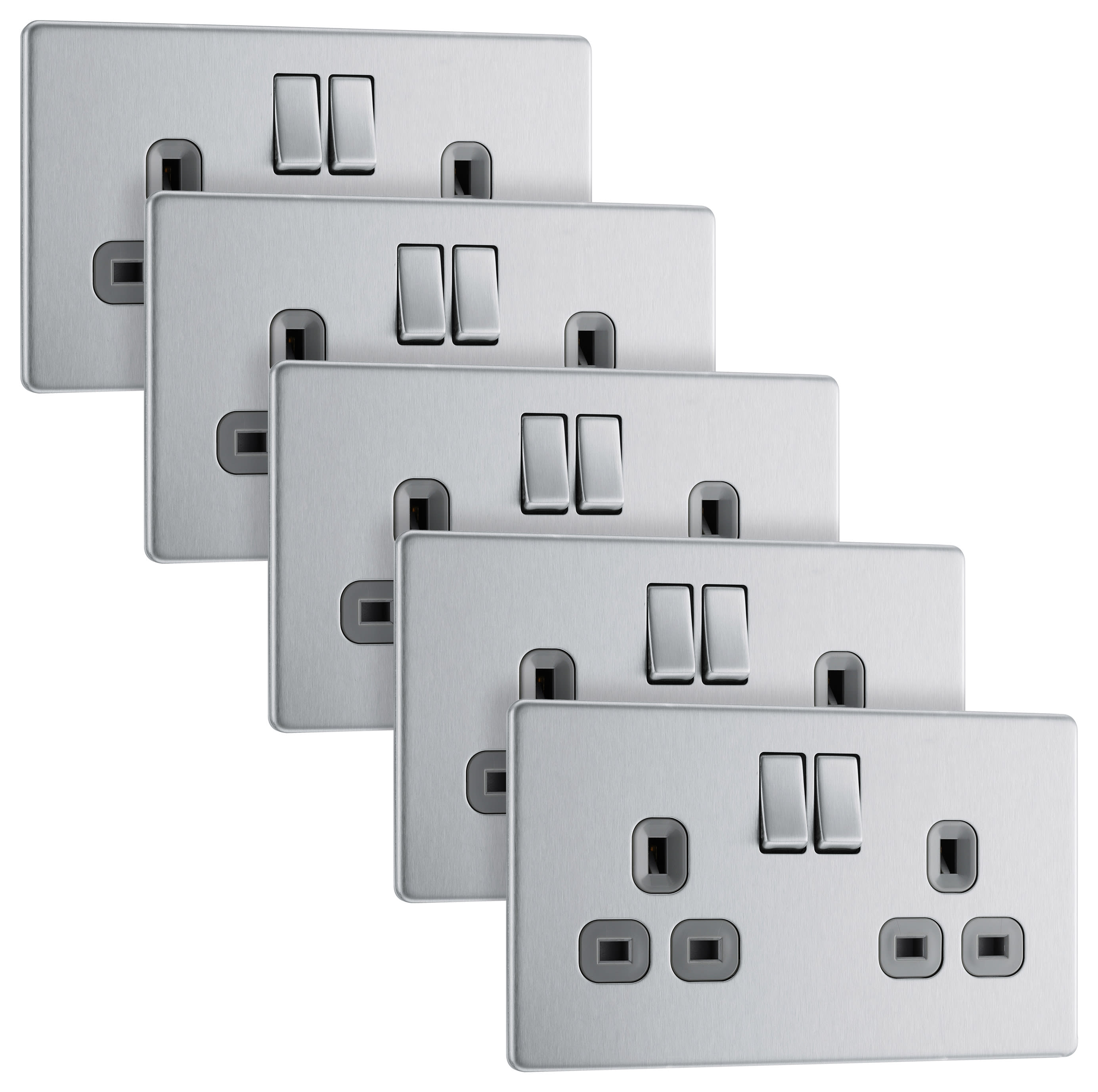 BG 13A Double Pole Screwless Flat Plate Double Switched Power Socket - Brushed Steel - Pack of 5