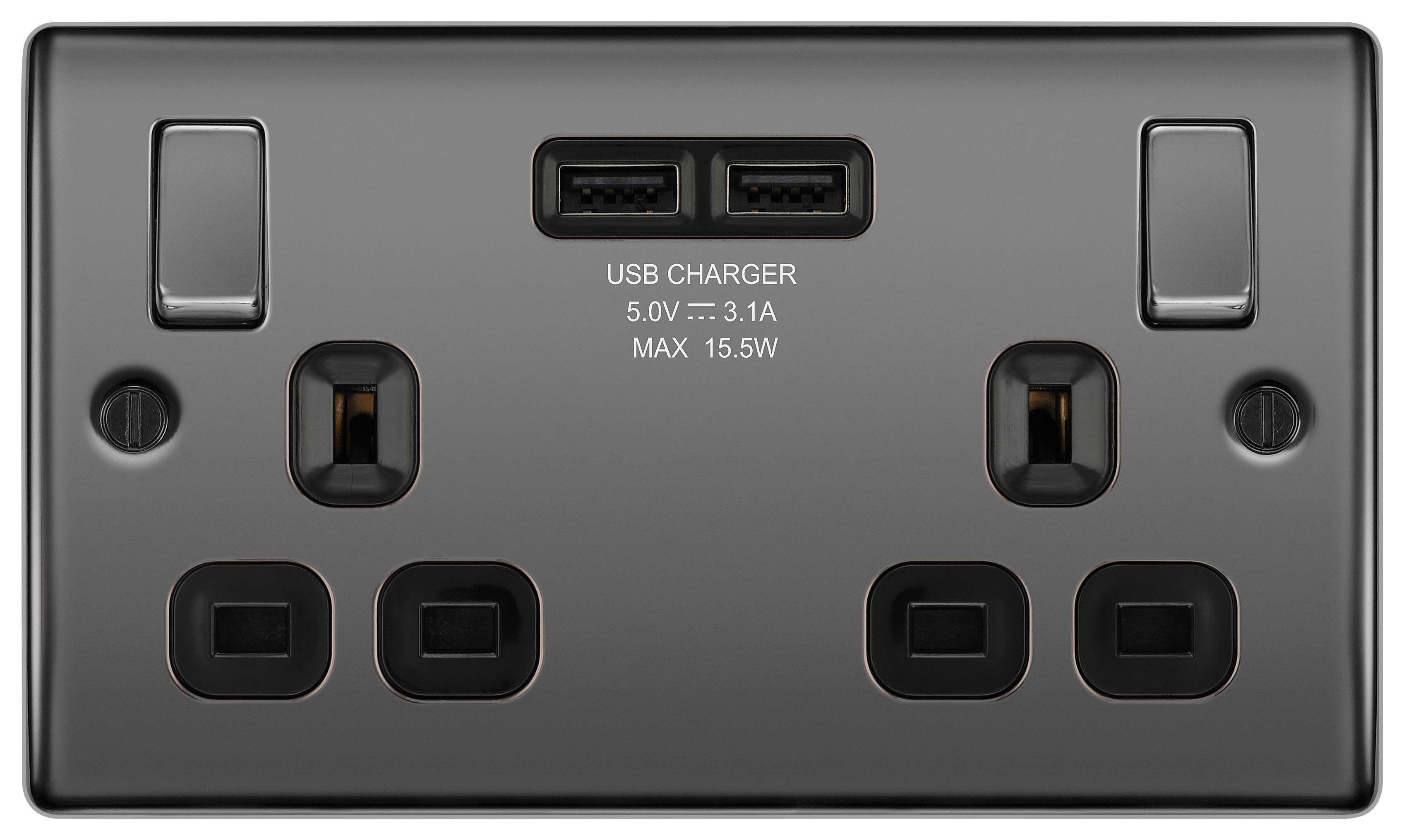 BG 13A Screwed Raised Plate Double Switched Power Socket with 2 x USB Sockets 3.1A - Black Nickel