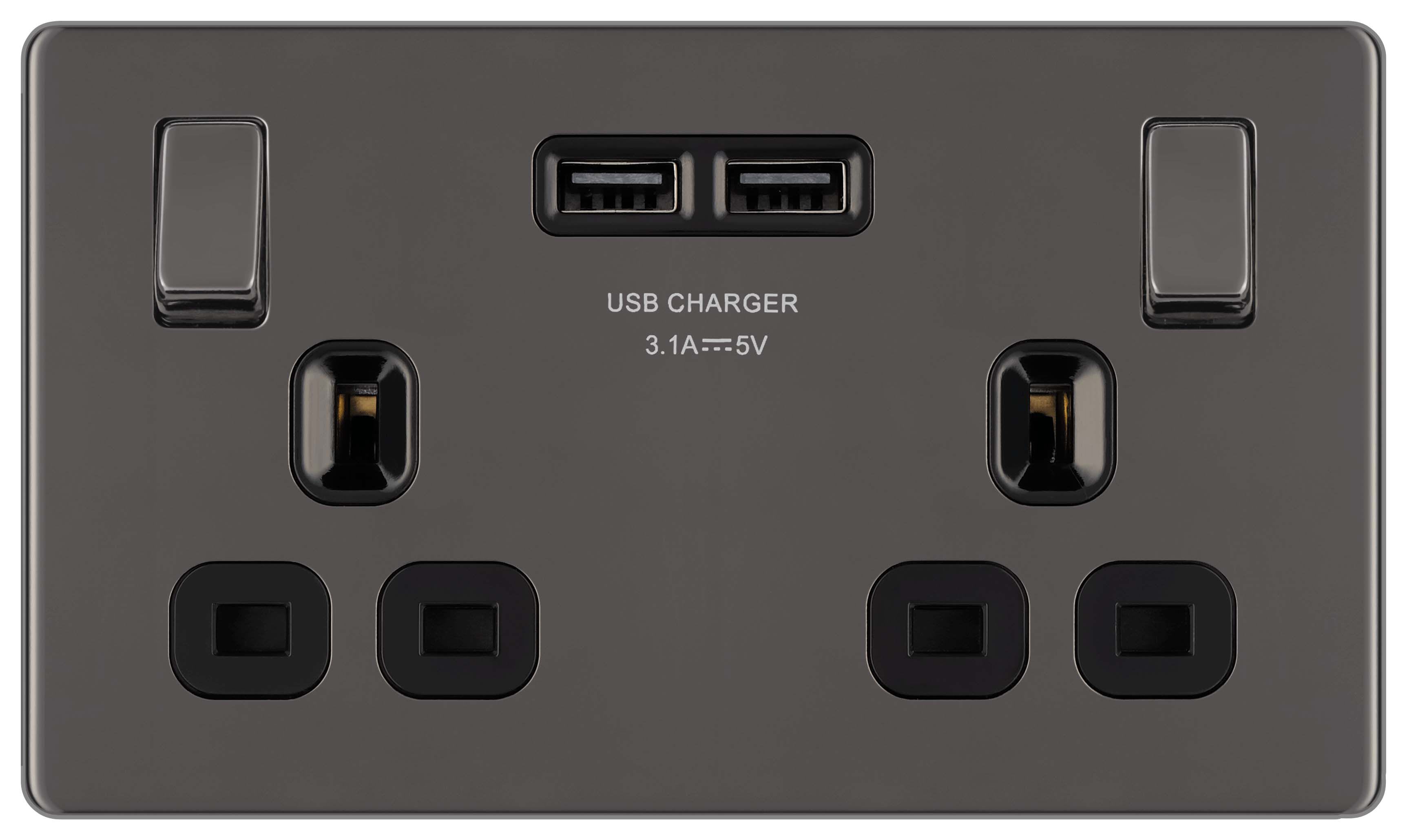 BG 13A Screwless Flat Plate Double Switched Power Socket with 2 x USB Sockets 3.1A - Black Nickel
