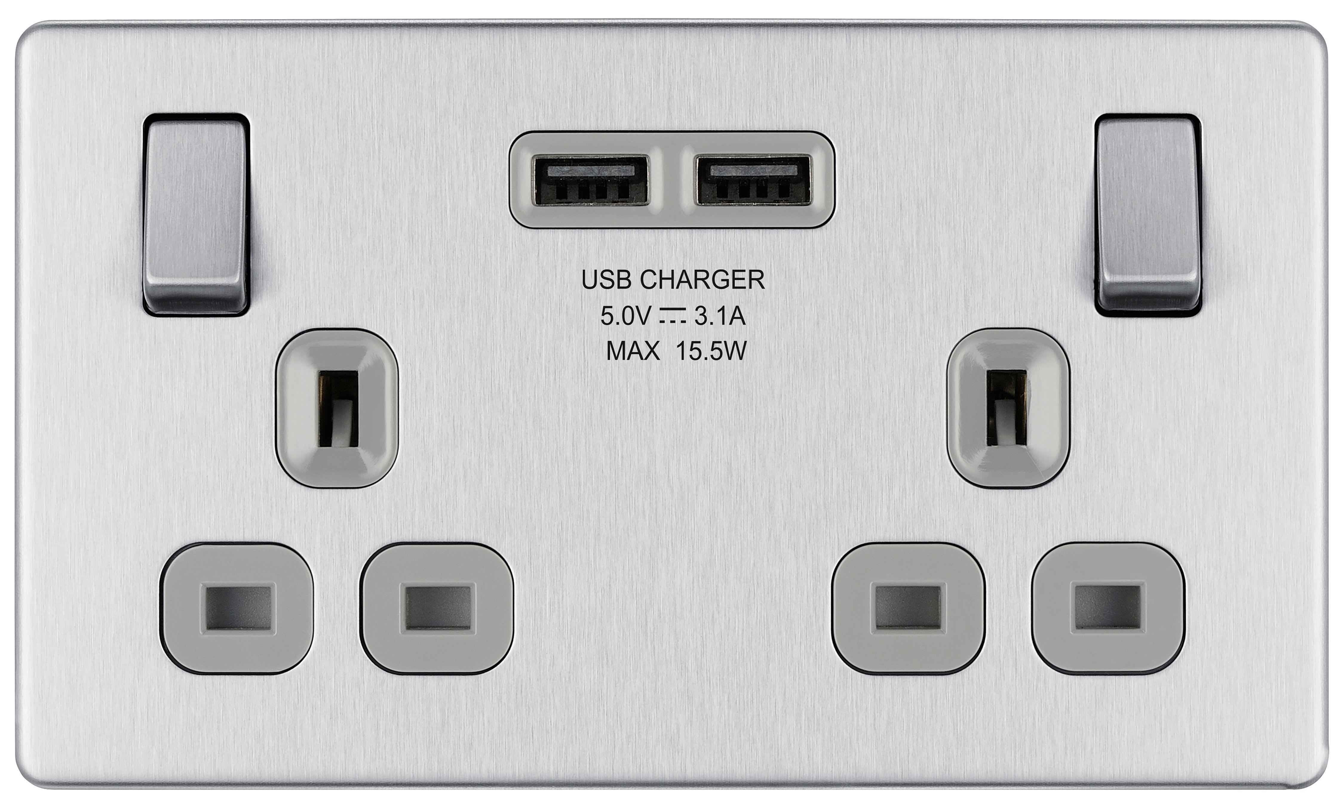 The BG 13A Screwless Flat Plate Double Switched Power Socket is a sleek and versatile solution for modern power and charging needs. Merging contemporary design with practical functionality, this power socket is crafted to elevate any interior space. Equipped with two USB sockets providing a total output of 3.1A, allowing for efficient charging of smartphones, tablets, and other USB-powered devices. The brushed steel finish adds a touch of modern elegance to your surroundings, seamlessly blending with various interior styles. The screwless design offers a seamless and sophisticated appearance, eliminating visible screws for a clean and minimalist look.