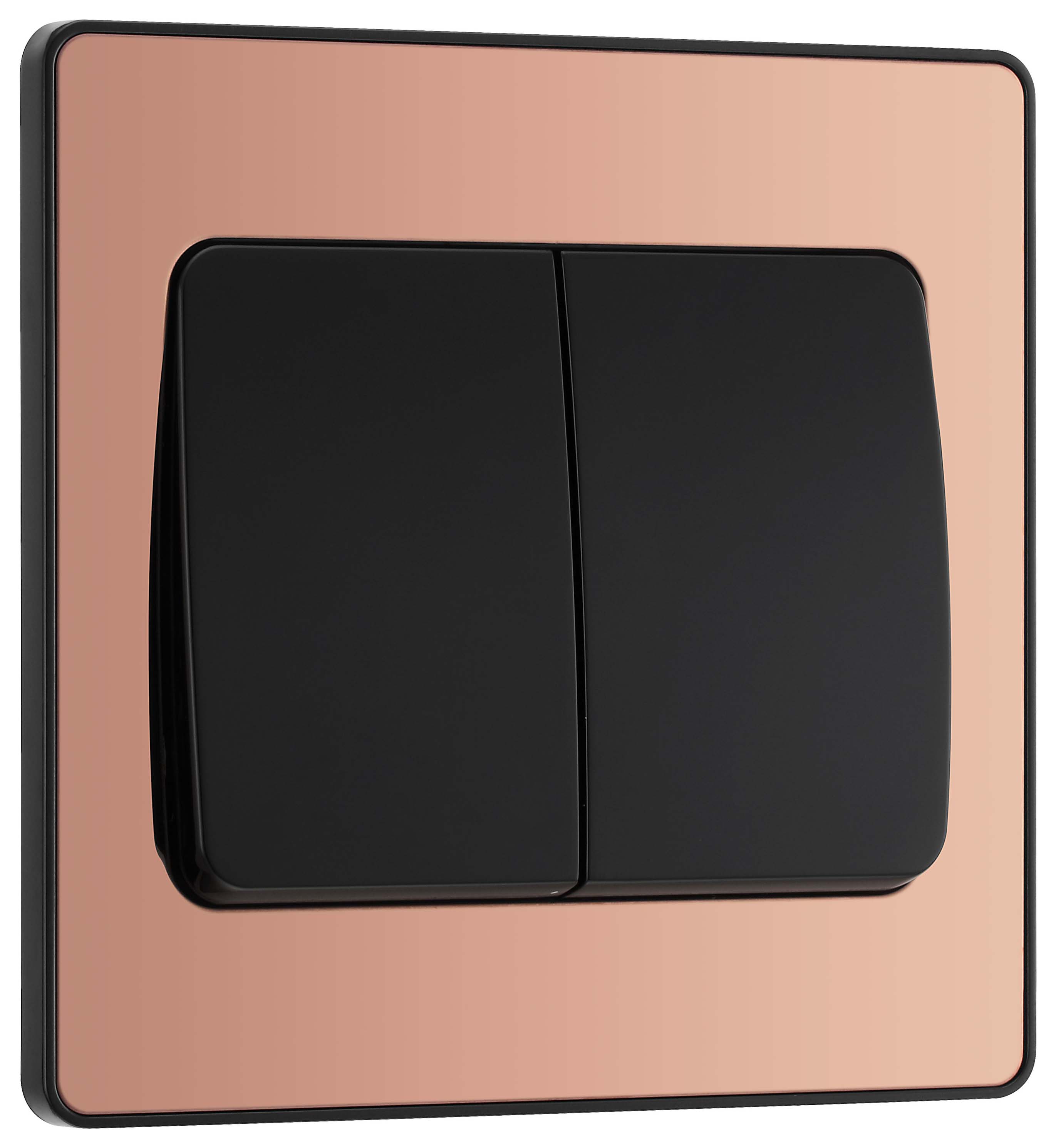 The BG Evolve Polished Copper Wide Rocker Double Light Switch can operate 2 different lights, whilst the 2 way switching allows a second switch to be added to the circuit to operate the same light from another location (e.g. at the top and bottom of the stairs). This switch has a wide rocker and a low profile screwless flat plate that clips on and off, making it ideal for modern interiors. The polished copper finish adds a touch of luxury and sophistication to any room, making it a striking focal point in your interior decor.