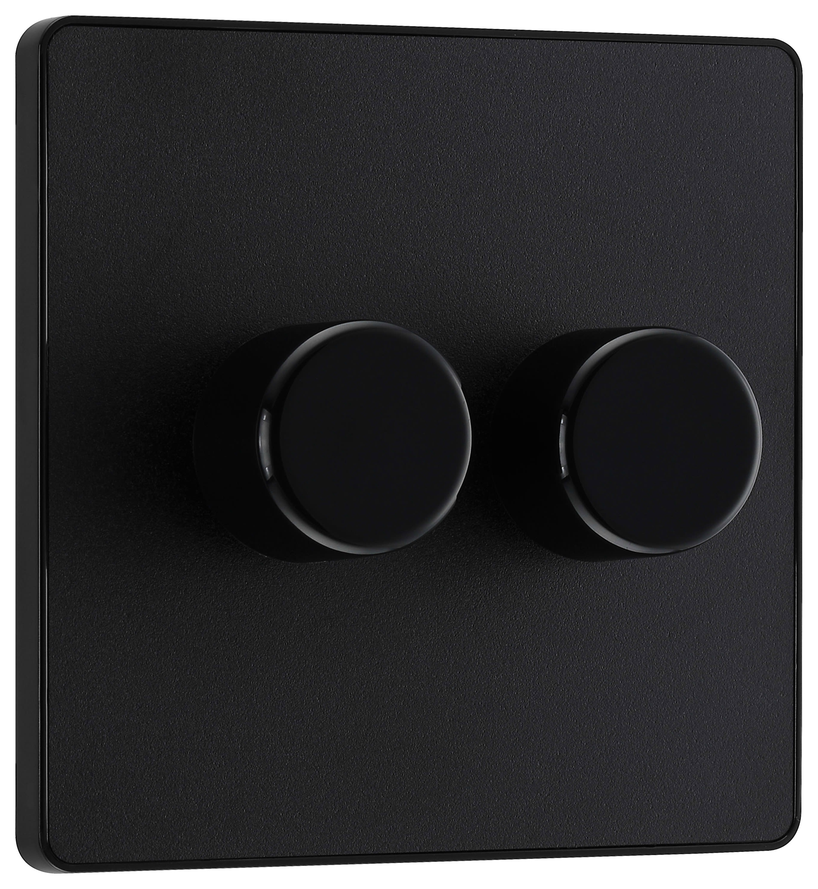 The BG Evolve Trailing Edge Led Push On / Off Double Dimmer Switch allows you to control your light levels and set the mood. The intelligent electronic circuit monitors the connected load and provides a soft-start with protection against thermal, current and voltage overload, and is suitable for dimming LED, dimmable CFL's and traditional lighting. This switch has a low profile screwless flat plate that clips on and off, making it ideal for modern interiors. The matt black finish adds a touch of modern elegance to any room, making it the perfect complement to a variety of interior design styles.