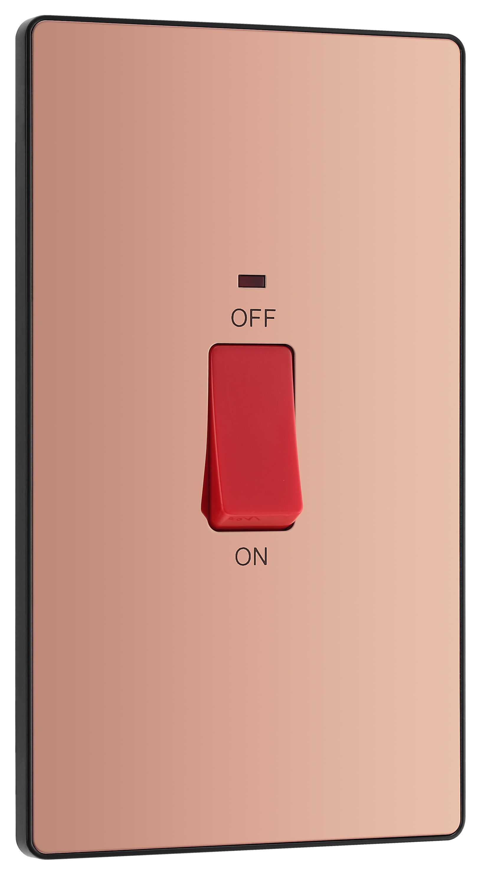The BG Evolve Rectangular Double Pole Switch with Led Power Indicator is ideal for use with cookers and has a large mounting plate measuring 146mm high x 86mm wide. This switch has a low profile screwless flat plate that clips on and off, making it ideal for modern interiors. The polished copper finish adds a touch of luxury and sophistication to any room, making it a striking focal point in your interior decor.