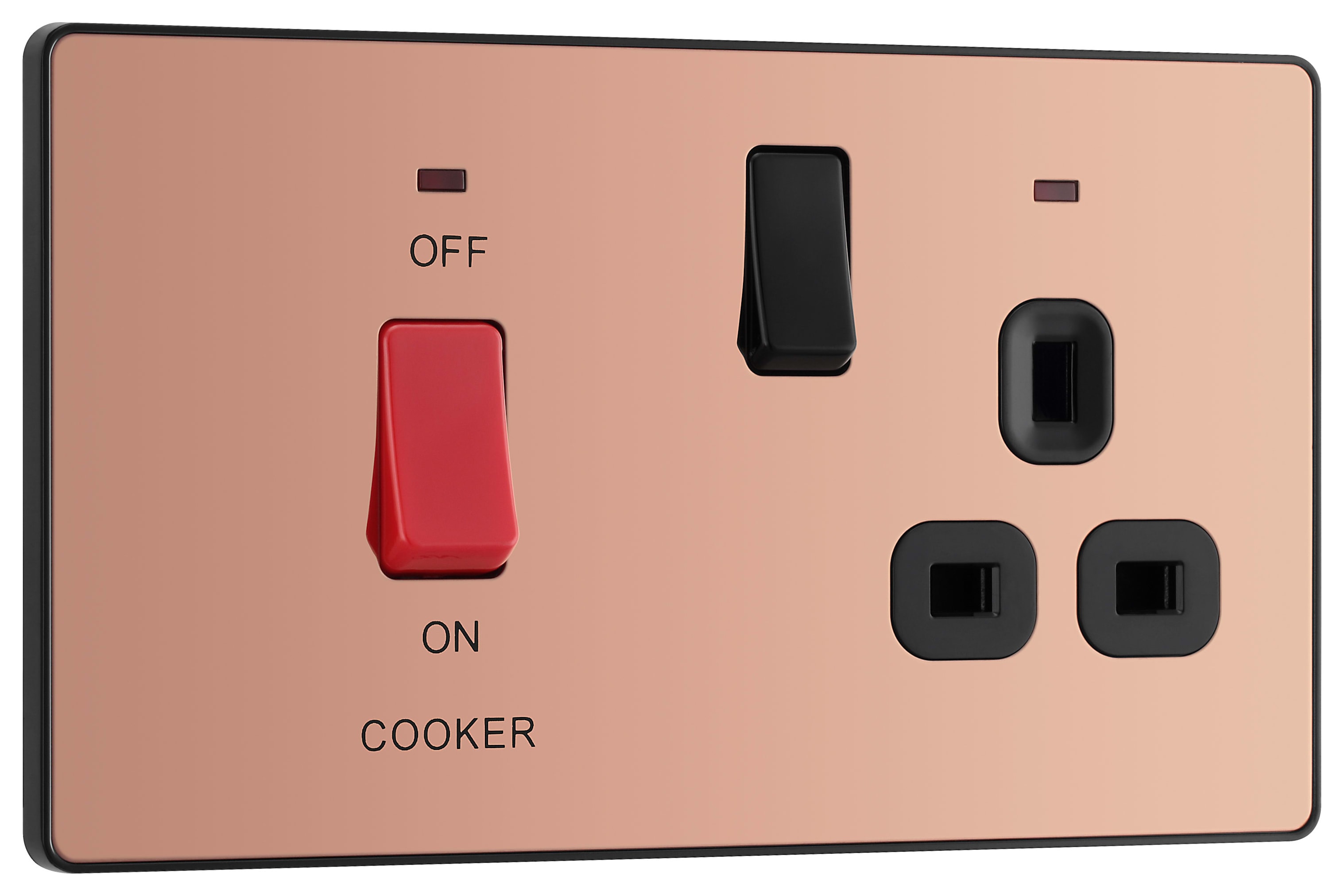 The BG Evolve Cooker Control Double Pole Socket and Switch with Led Power Indicators includes a 13A socket for an additional appliance outlet, and has flush LED indicators above the socket and switch. This cooker control unit has a low profile screwless flat plate that clips on and off, making it ideal for modern interiors. The polished copper finish adds a touch of luxury and sophistication to any room, making it a striking focal point in your interior decor.