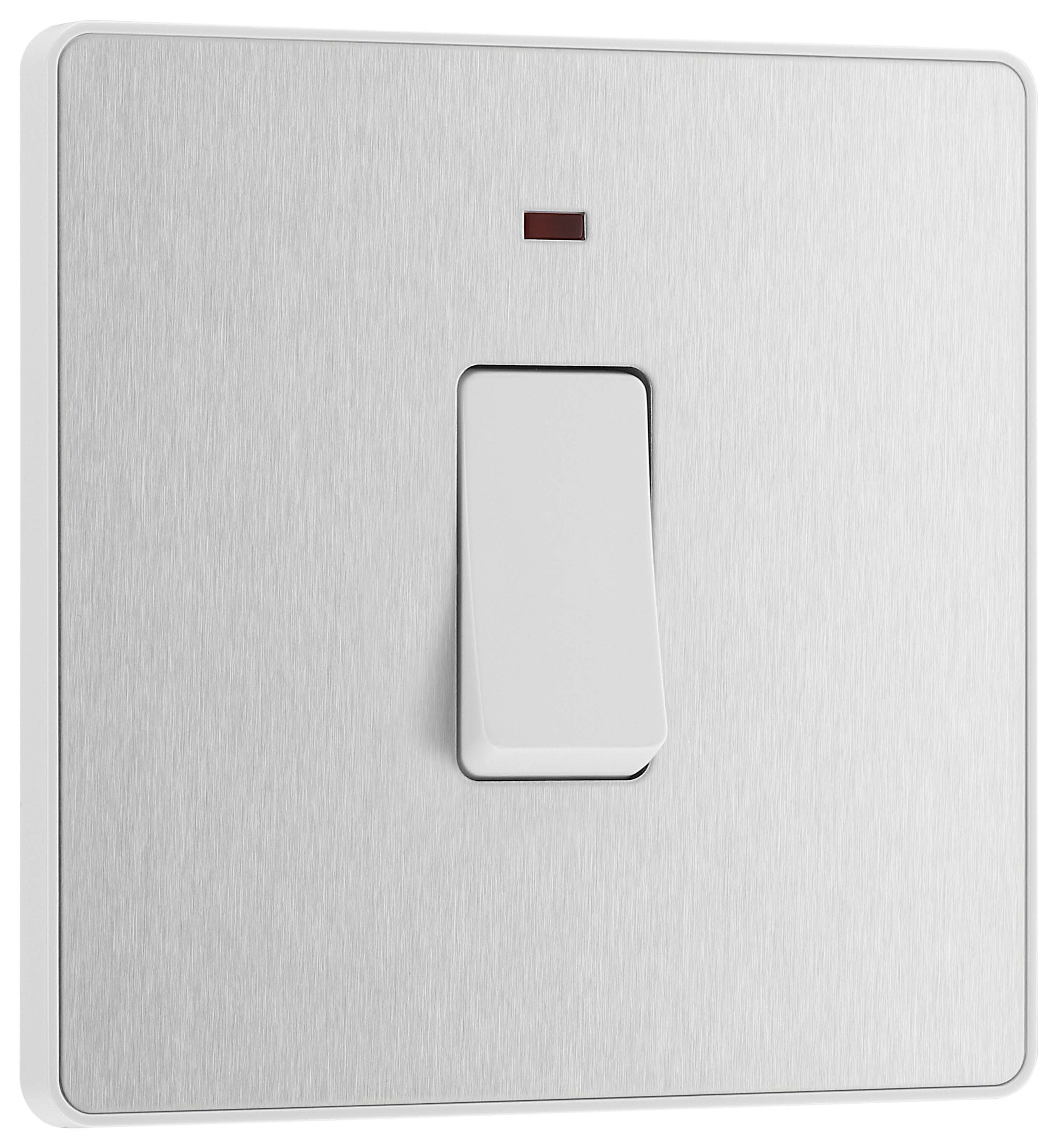 This BG Evolve Double Pole Switch with Power Led Indicator has been designed for the connection of refrigerators, water heaters, central heating boilers and many other fixed appliances. This switch has a low profile screwless flat plate that clips on and off, making it ideal for modern interiors. The brushed steel finish adds a touch of contemporary elegance to any room, effortlessly complementing a wide range of interior design styles.