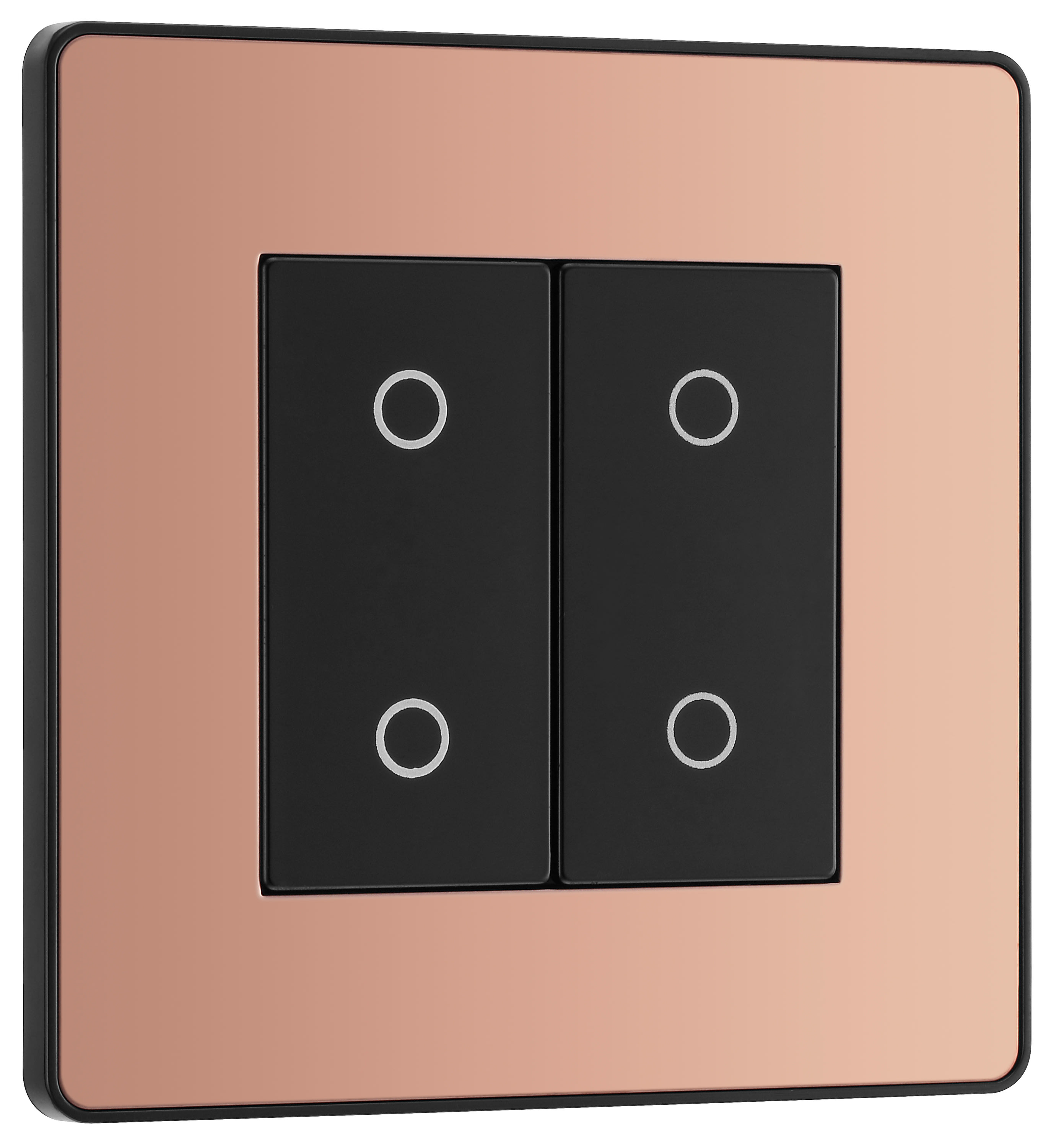 The BG Evolve Master Double Touch Dimmer Switch allows you to control your light levels and set the mood. The intelligent electronic circuit monitors the connected load and provides a soft-start with protection against thermal, current and voltage overload, and is suitable for dimming LED, dimmable CFL's and traditional lighting. This dimmer has a low profile screwless flat plate that clips on and off, making it ideal for modern interiors. The polished copper finish adds a touch of luxury and sophistication to any room, making it a striking focal point in your interior decor.