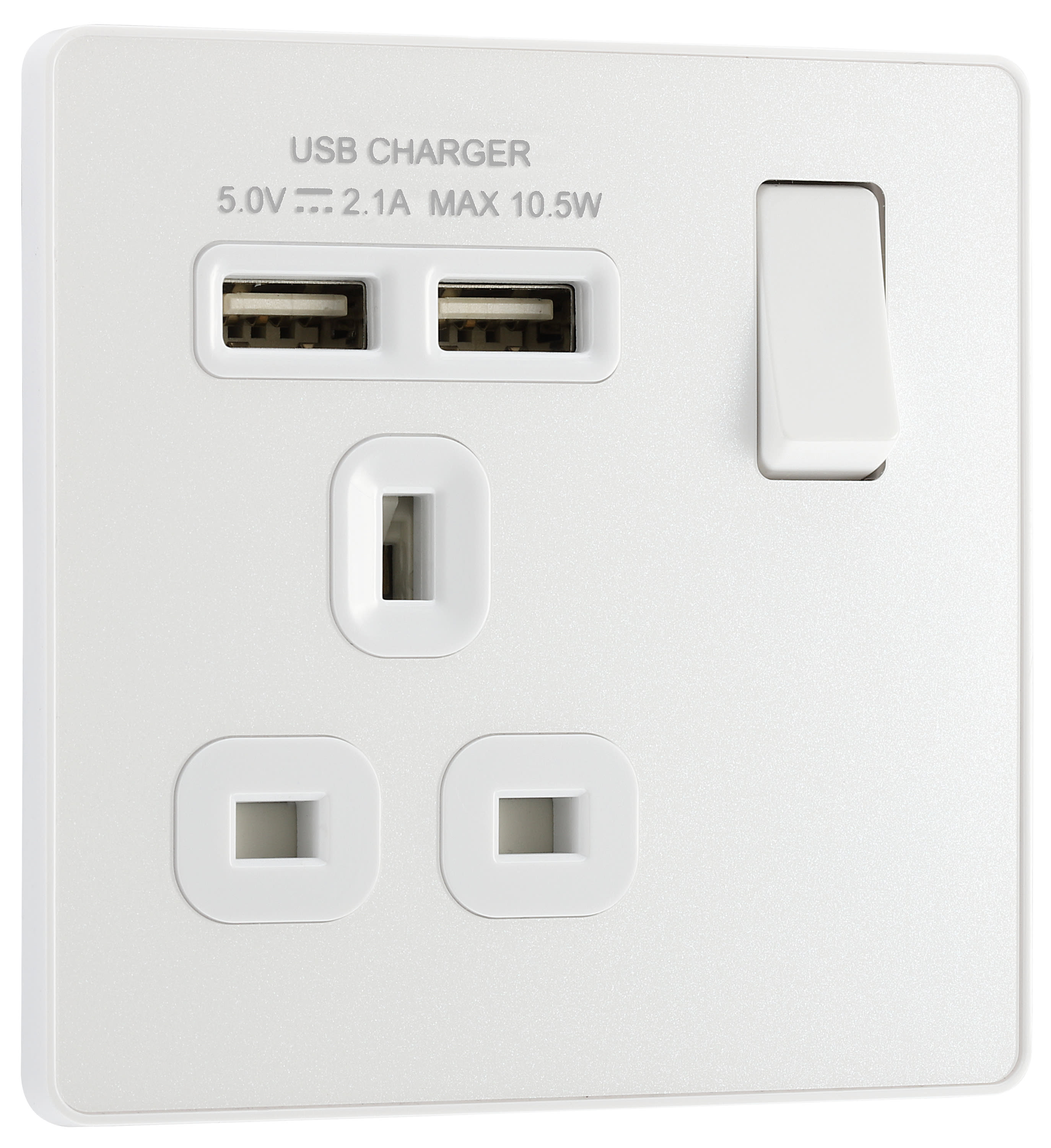 BG Evolve Single Switched 13A Power Socket with 2 x USB (2.1A) - Pearlescent White