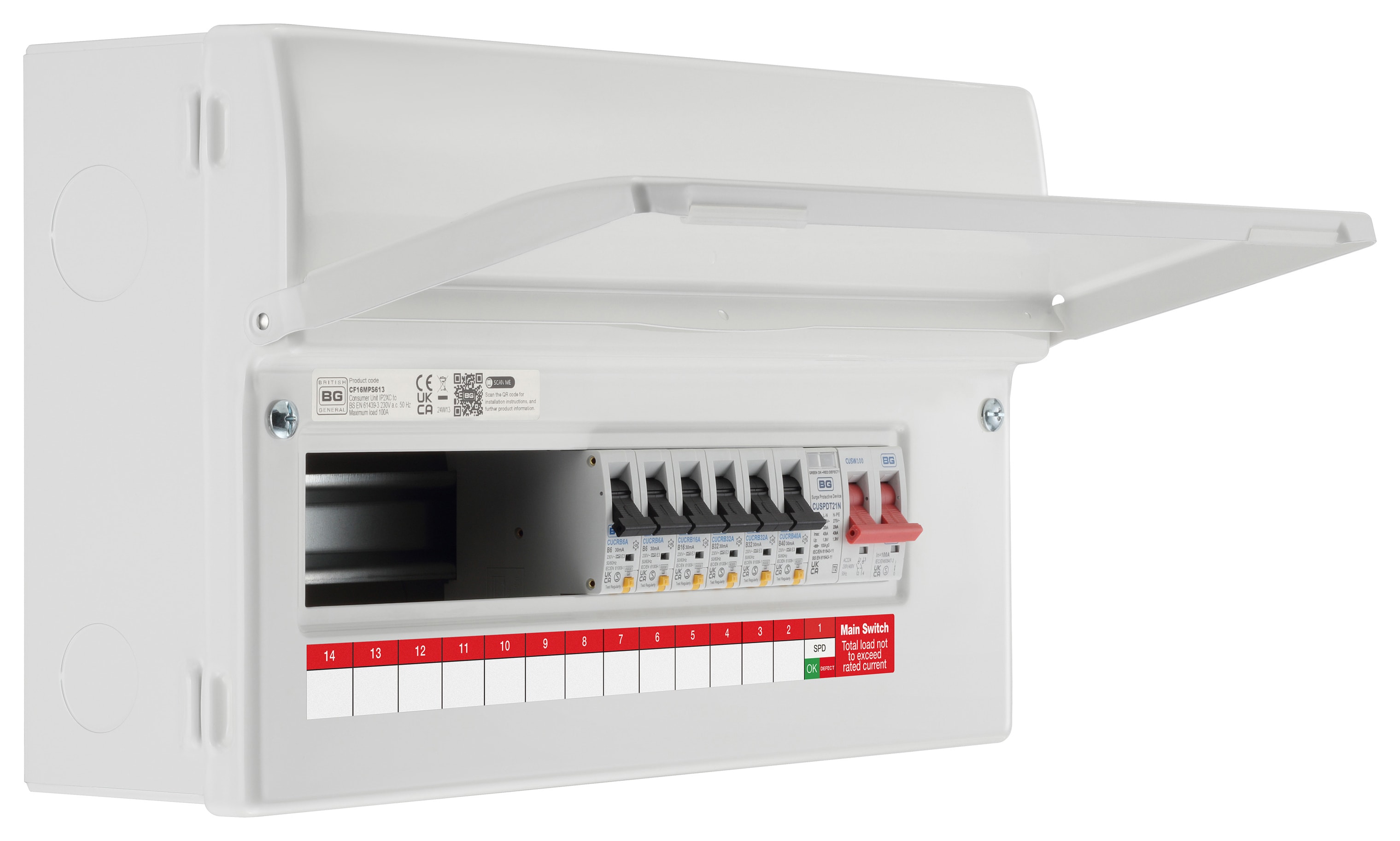 BG Main Switch 100A Populated 16-Module 13 Way Consumer Unit with Type 2 SPD & 6 x Type A RCBOs