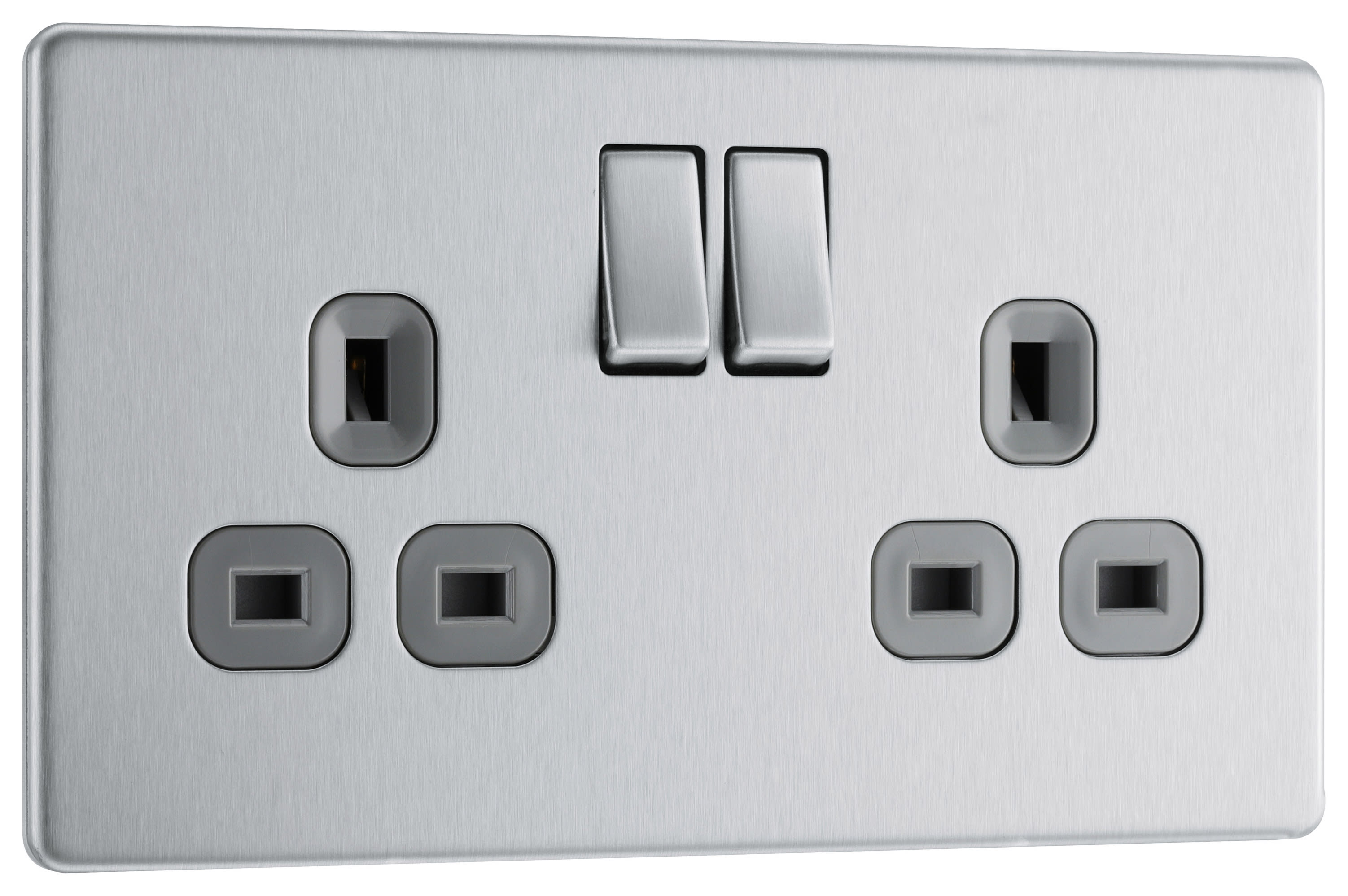 BG Screwless Flat Plate Double Switched 13A Power Socket Double Pole - Brushed Steel