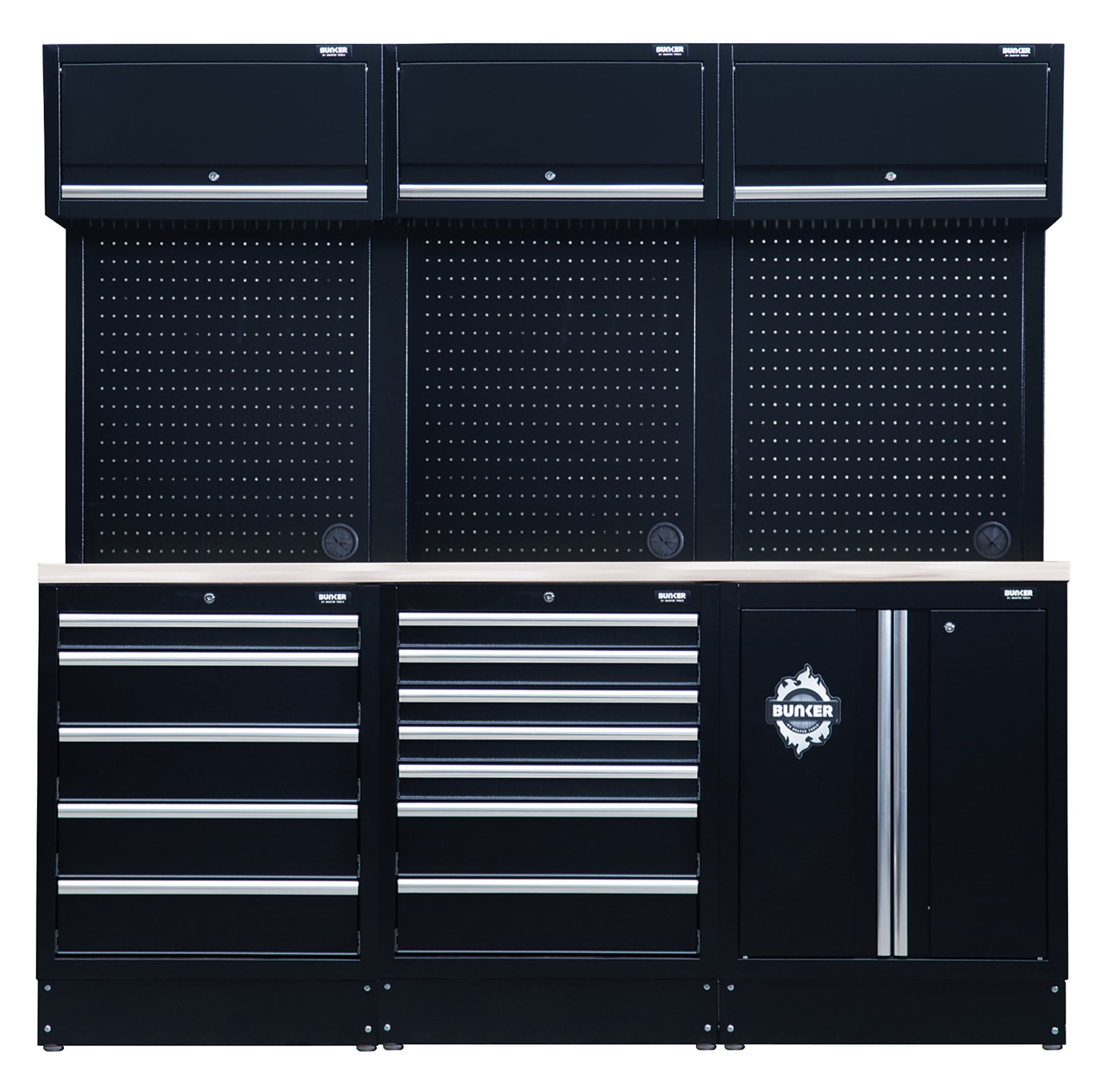 Part of the BUNKER® modular storage system. This stunningly designed combo is easily installed inside a garage or workshop to create your ideal storage system. All units are made from premium-quality steel and have a durable matt black textured industrial powder-coated finish. The floor cabinets are covered by a stylish stainless steel worktop and provide incredibly versatile storage, featuring large cupboards with fully adjustable shelves and smooth soft-close drawers lined with lush foam to protect your tools. The fixed base cabinets have adjustable feet for optimal positioning on an uneven floor. All wall cabinets have lift-up doors for convenient access, operated by whisper-quiet gas struts. For added storage, the back panels act as pegboards, and each includes one pre-cut hole for access to a power supply. Each unit has an integral lock for security and 2 keys are supplied. The combo comes with all the required fittings for simple installation. For your quality assurance, all BUNKER® units include a 10-year warranty. Every combo includes a free magnet of the distinctive BUNKER® logo.