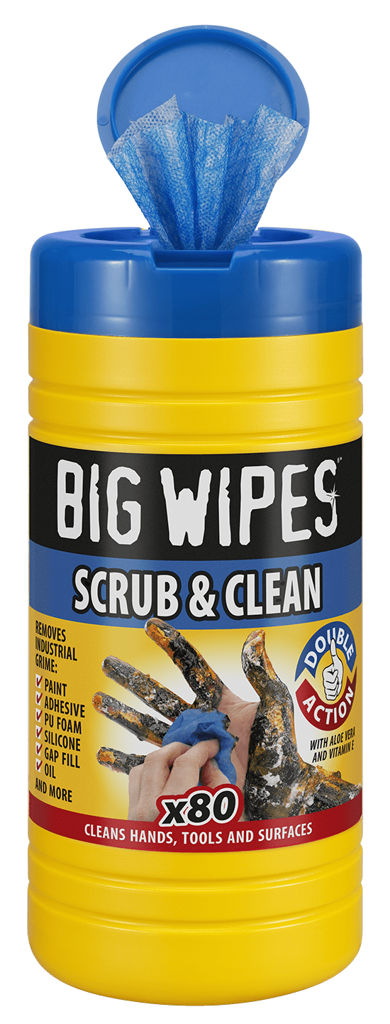 The Big Wipes Heavy-Duty Antiviral Scrub and Clean Wipes are every tradesperson’s best friend offering heavy-duty cleaning. The dual-sided, textured fabric quickly and effectively 'grabs and removes' even the most stubborn muck and grime. Scrub and clean wipes easily remove paint, oil, PU foam, silicone, grease, gap fill, adhesive and more from hands, tools and surfaces. Dermatologically tested with vitamin E and aloe vera to protect and nourish hands.