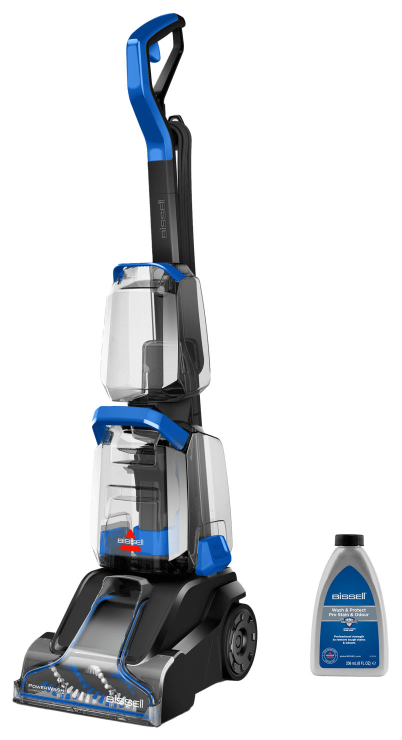 Bissell 4055E PowerWash Compact Upright Carpet Washer provides an unbeatable clean on high-traffic areas and everyday tough ground-in dirt and stains in small spaces. Using powerful suction in combination with 4-Row DeepReach™ PowerBrush, this machine can tackle even the most challenging messes and remove stains that a vacuum leaves behind. The removable nozzle allows a quick and easy rinse to keep your machine working like new. Its compact and lightweight figure is designed to clean throughout your home and make storing easy. Bissell® PowerWash Compact upright cleaner comes with a 236ml sample bottle of our Wash and Protect Pro Stain and Odour cleaning solution, designed to eliminate tough, ground-in messes and prevent future stains with the power of StainProtect.