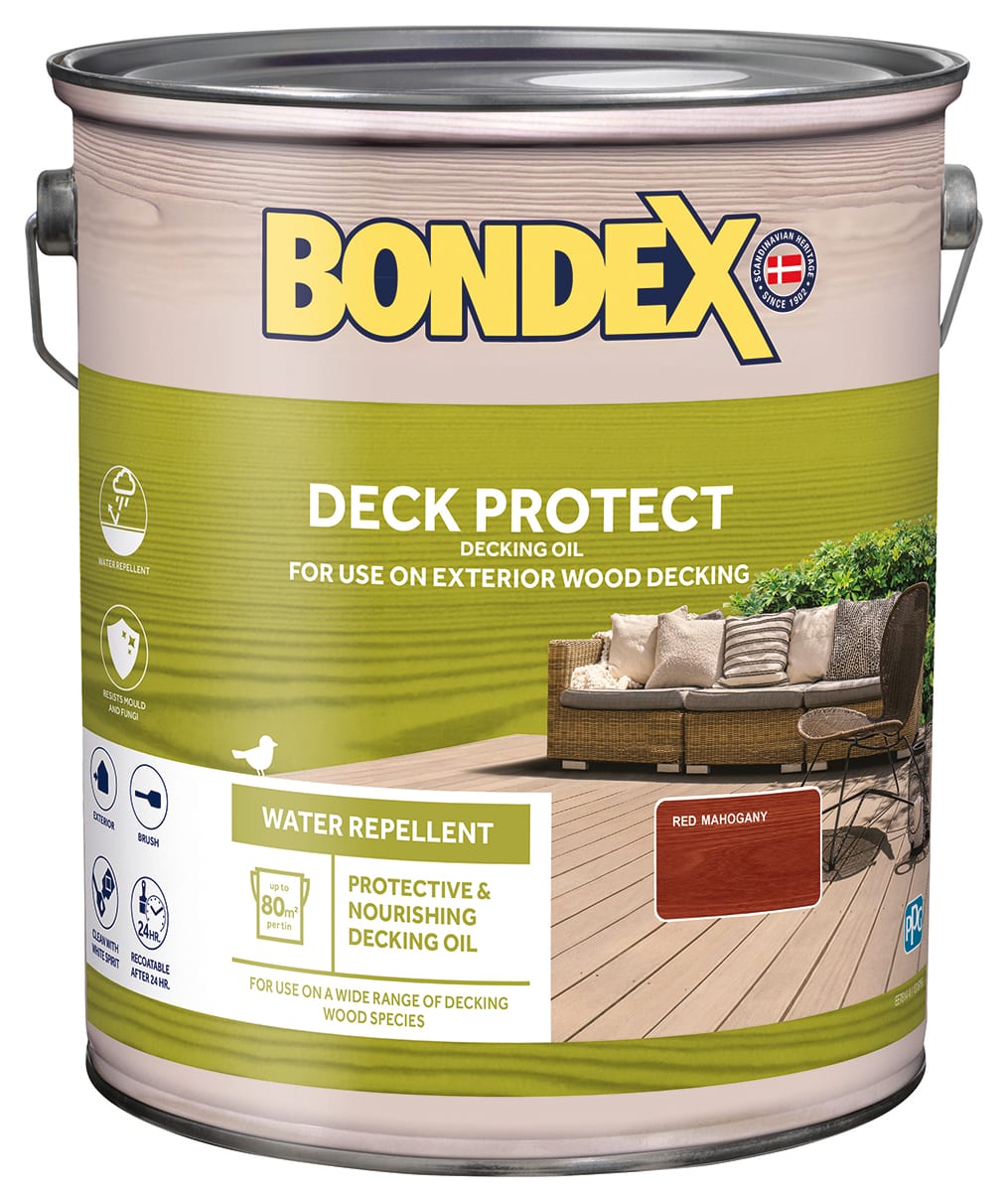 The Bondex Deck Protect is a water based, translucent an nourishing oil for outdoor wooden decks. It offers double durability compared to conventional decking oil, and decks can be walked on only one hour after application.