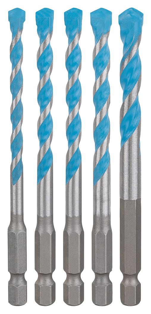 Bosch 5 Piece Expert Hex-9 Multi Construction Drill Bit Set can drill accurately into hard materials, such as granite, without skidding – thanks to its sharp tip and advanced geometric design. Made from optimised carbide using our fine grinding manufacturing technique, it can also tackle concrete, brick, soft tile, wood and metal. It can always do a professional job – whatever the material. Hex shank for a strong connection and maximum torque transmission in three-jaw chucks and ¼" internal hex tool holders.
