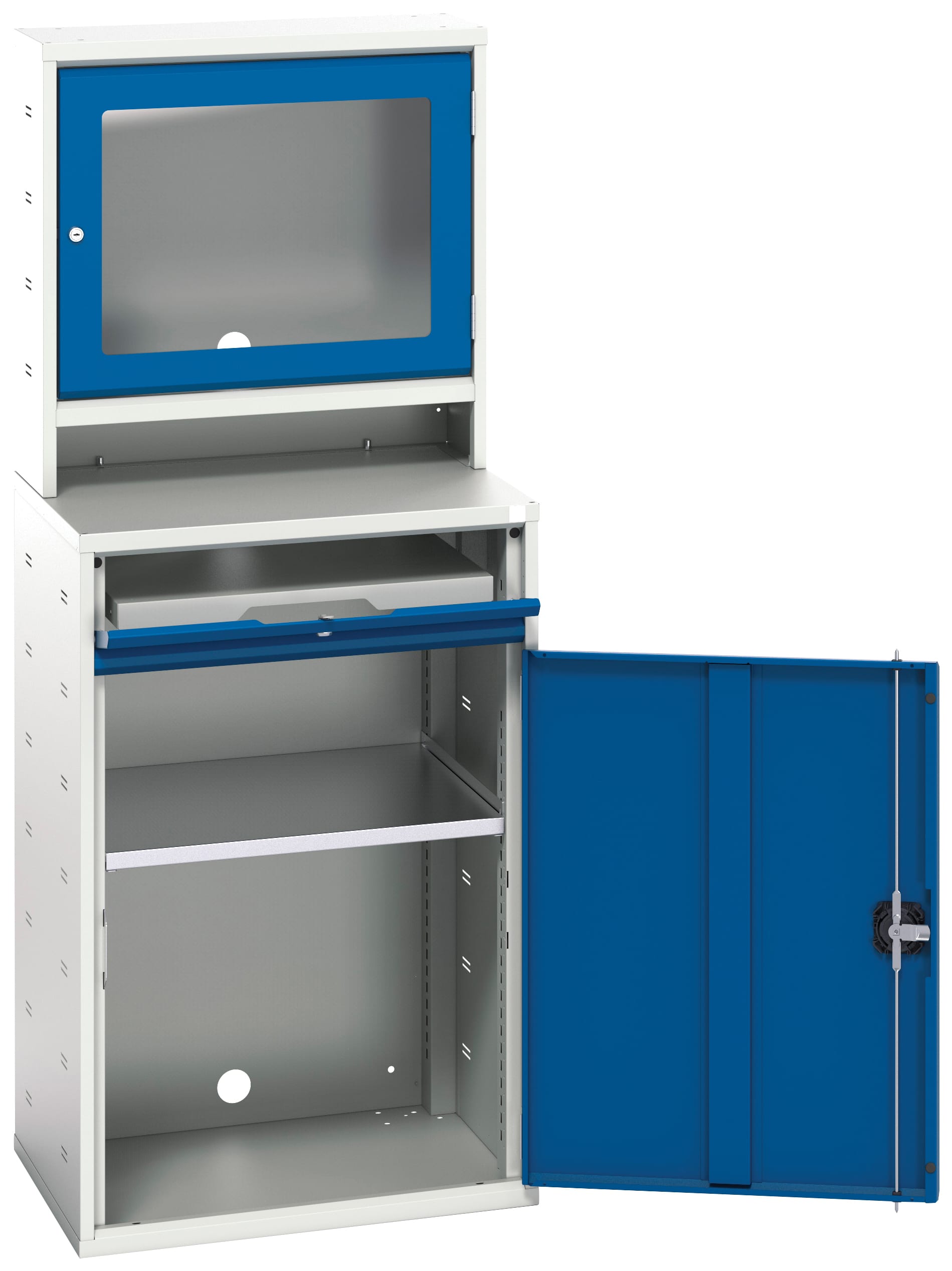 This Bott Verso Computer Workstation has robust, fully welded steel housing finished in durable powder coat paint (RAL 7035 light grey and RAL 5010 gentian blue). It features a lockable, ventilated monitor cupboard with window door, writing top and backpanel, lockable cupboard, and lockable slide out keyboard tray. The workstation keeps computer equipment secure from theft and unauthorised access in the workplace. The cupboard also has 1 adjustable height, galvanised steel shelf (75kg U.D.L.). Designed to withstand the rigours of daily use by schools, colleges, universities, libraries, offices and heavy-duty industrial environments.Internal Monitor Cupboard Dimensions (WxDxH): 646 x 217 x 548mm. This Bott Verso Computer Workstation features a single door cupboard.