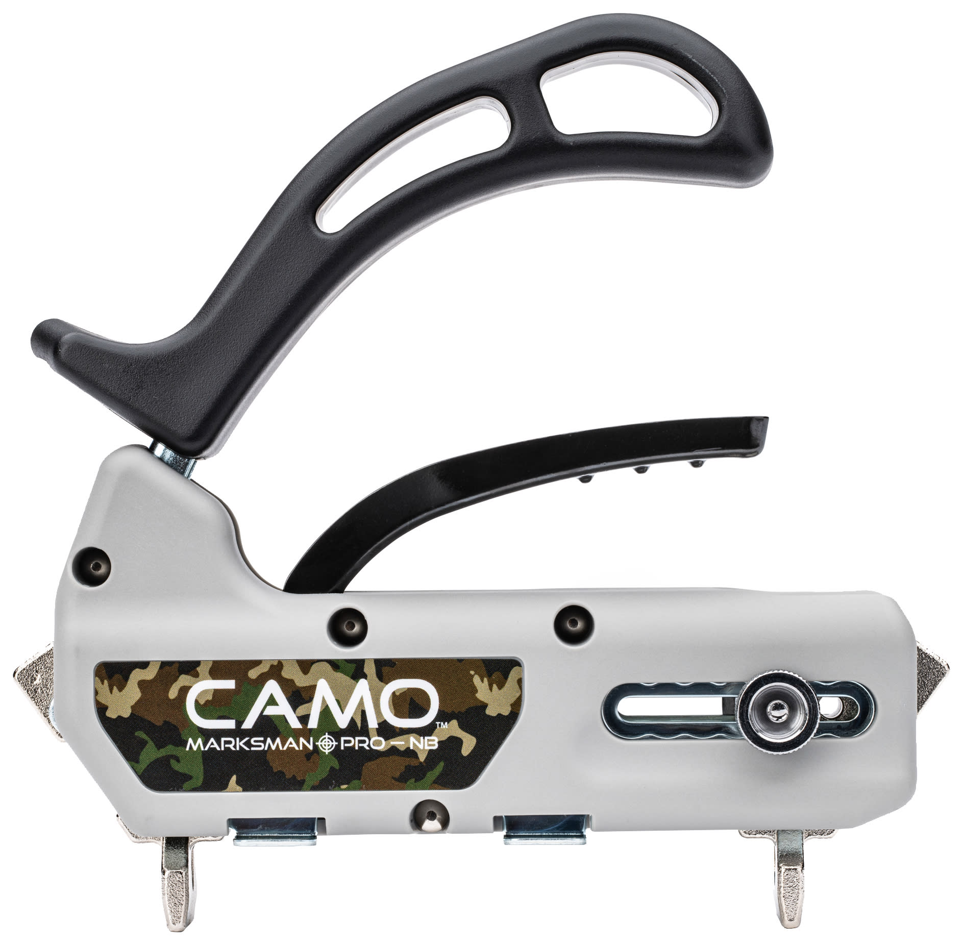 Camo Marksman PRO-NB 5mm Protech Hidden Deck Screw Starter Kit for 133-146cm boards creates a fastener-free deck surface for wood, composite, and hardwood decking. The included Camo Edge Screws install into the edge of the board, and the screws auger material out to reduce splitting and cracking. The tool creates a 5mm deck board space automatically and ensures consistent fixing every time.