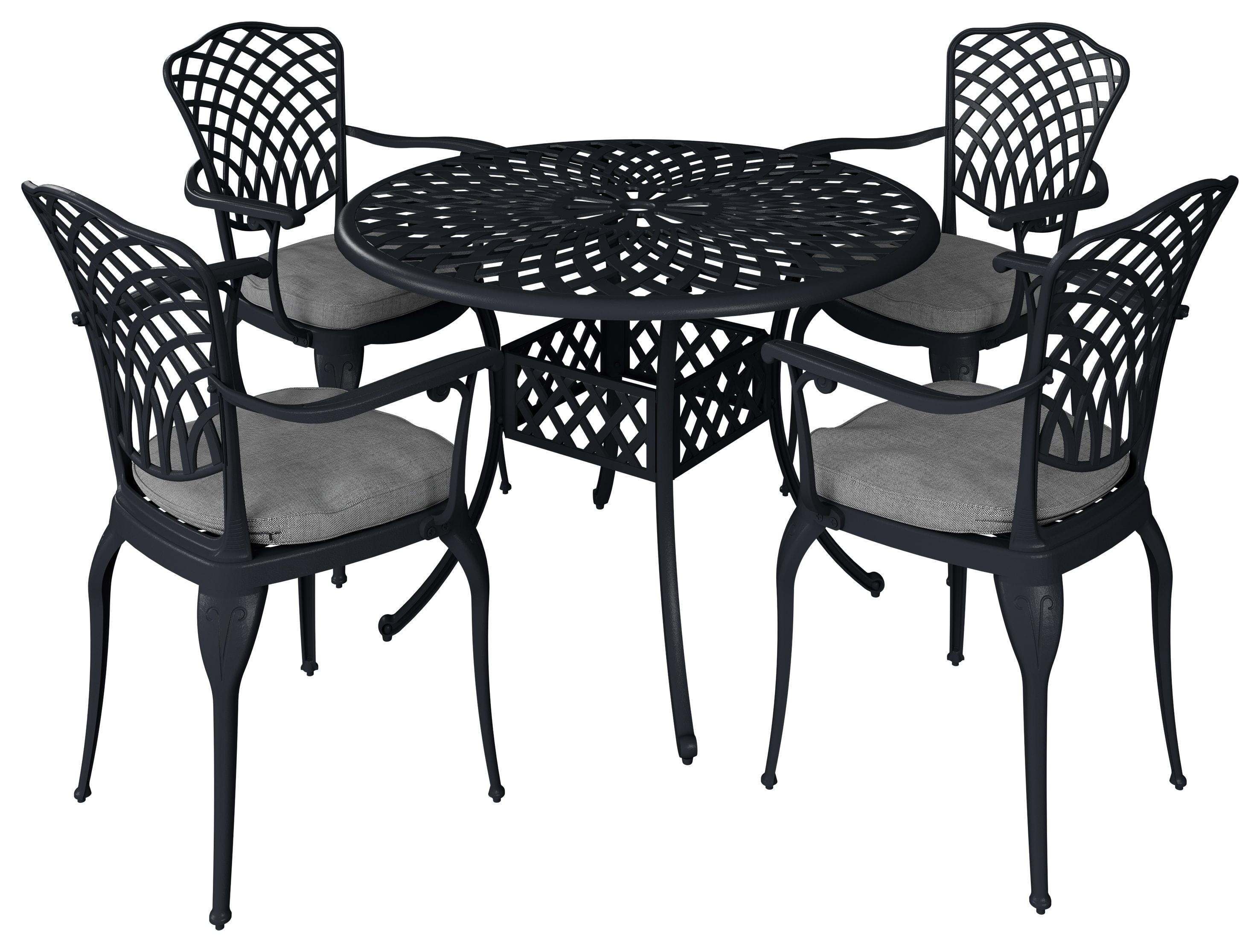 Our cast garden furniture set features a beautifully crafted dining table and four matching chairs, all designed with intricate detailing that adds a touch of sophistication to any outdoor setting. The grey cushions provided with the chairs enhance the comfort, ensuring you and your guests can enjoy long, leisurely meals outdoors. This set is great for four people, making it ideal for family dinners, social gatherings, or simply enjoying a cup of coffee in the morning sun with a couple of friends. Not just great to look at, but constructed from high-quality cast aluminium, this dining table set is built to withstand the elements. The weatherproof design ensures that the furniture remains in excellent condition throughout the year, providing long-lasting use. One of the standout features of this aluminium outdoor furniture set is the central hole in the table, which allows for the easy addition of an umbrella. This feature provides additional shade on sunny days, enhancing your comfort while dining outdoors. The removable cushion covers are also machine washable, making maintenance a breeze and keeping your furniture looking fresh and inviting.