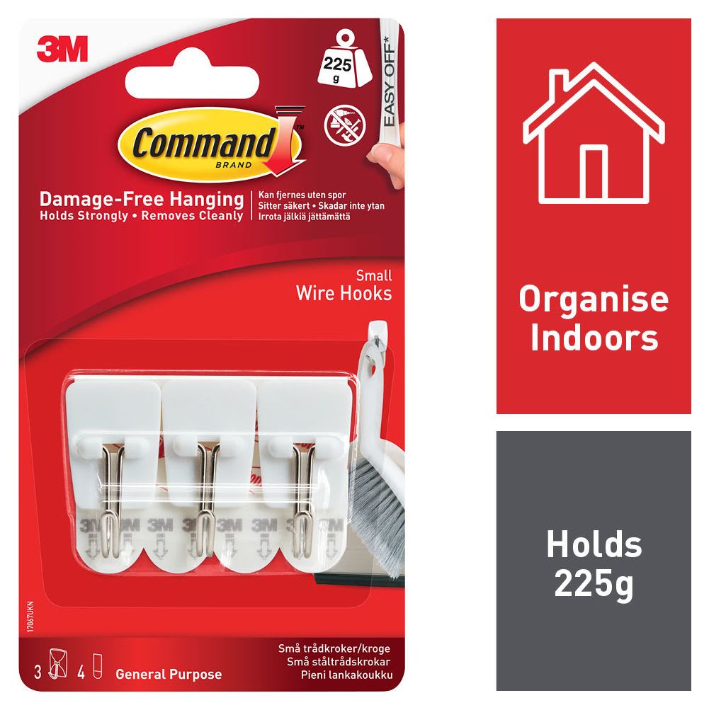 Command Wire Hooks can each hold up to 225g in weight, making them the ideal organisational solution for household, kitchen and office items. They can be applied to almost any flat, clean surface.