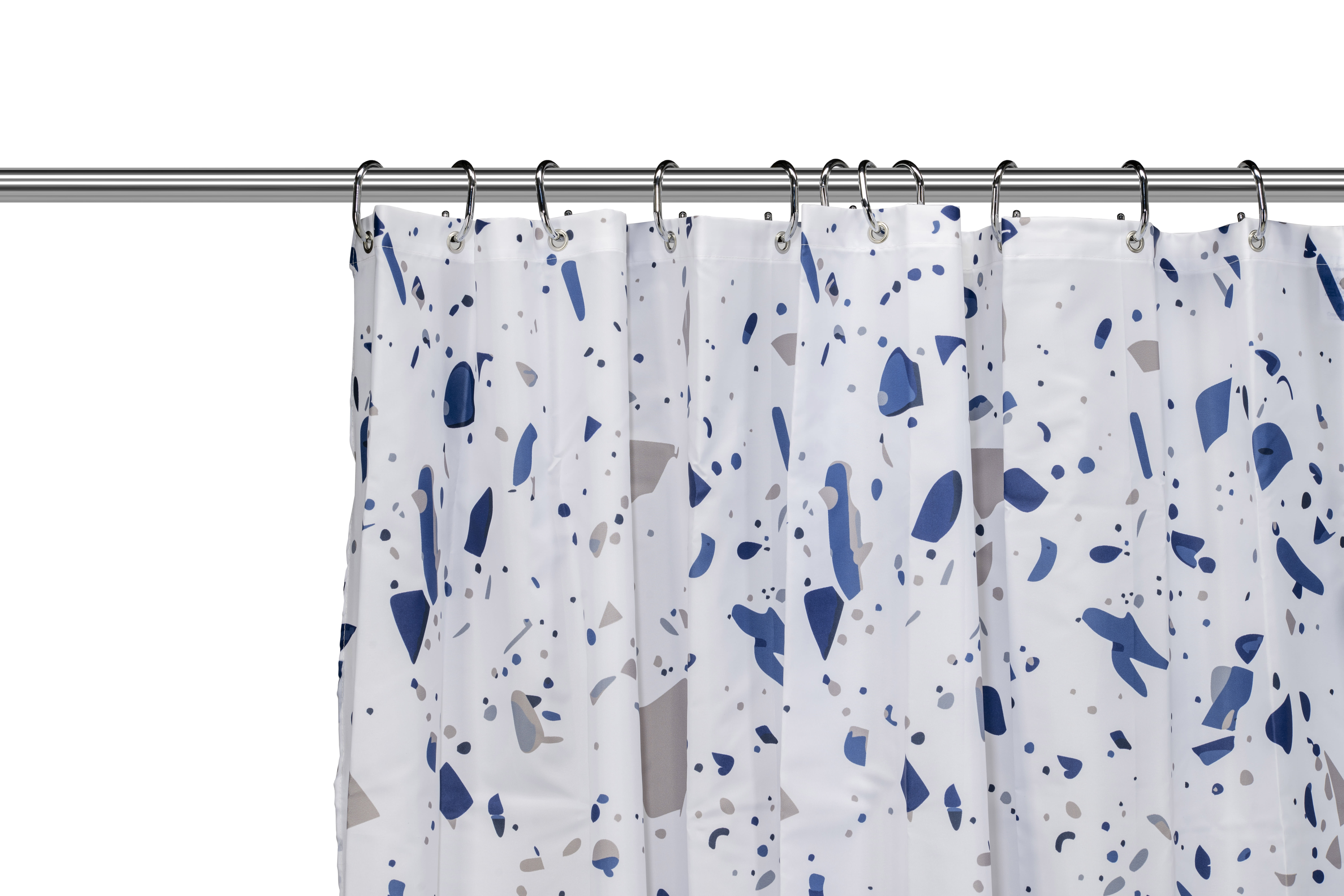 Reinvigorate your bathroom with this fresh textile shower curtain. Offering an instant refresh, it’s ready to hang with tear-resistant eyelets and crafted from durable, water-repellent fabric. A weighted hem keeps it in place, putting an end to the mid-shower fight with a clingy curtain! Inspired by Mediterranean style, the modern blue terrazzo print brings a breezy, coastal charm that instantly elevates your space. This essential accessory adds both function and flair to any bathroom retreat.