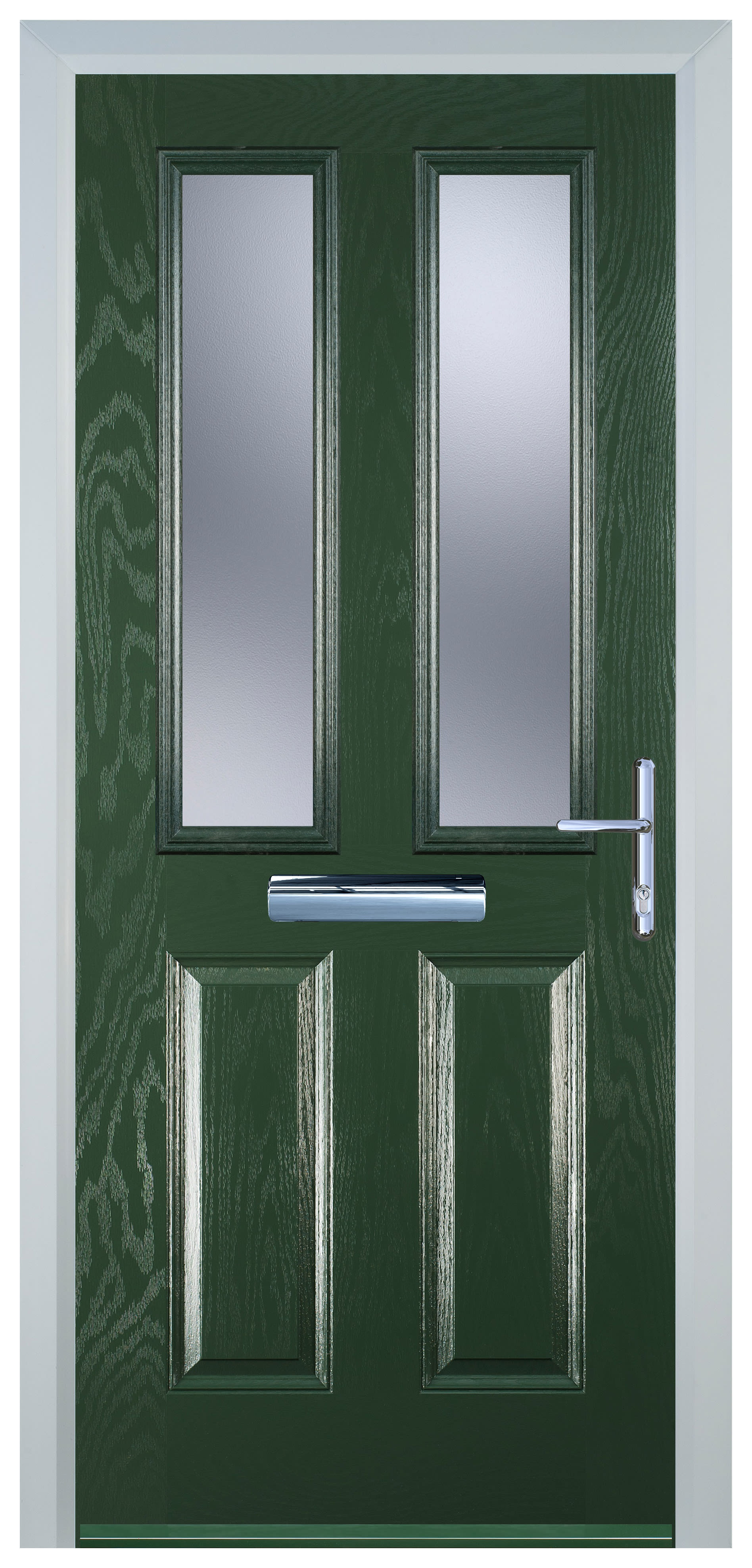 - Door leaf design features a green external and white internal GRP skin colour, and two glass panels in a stippolyte glass pattern