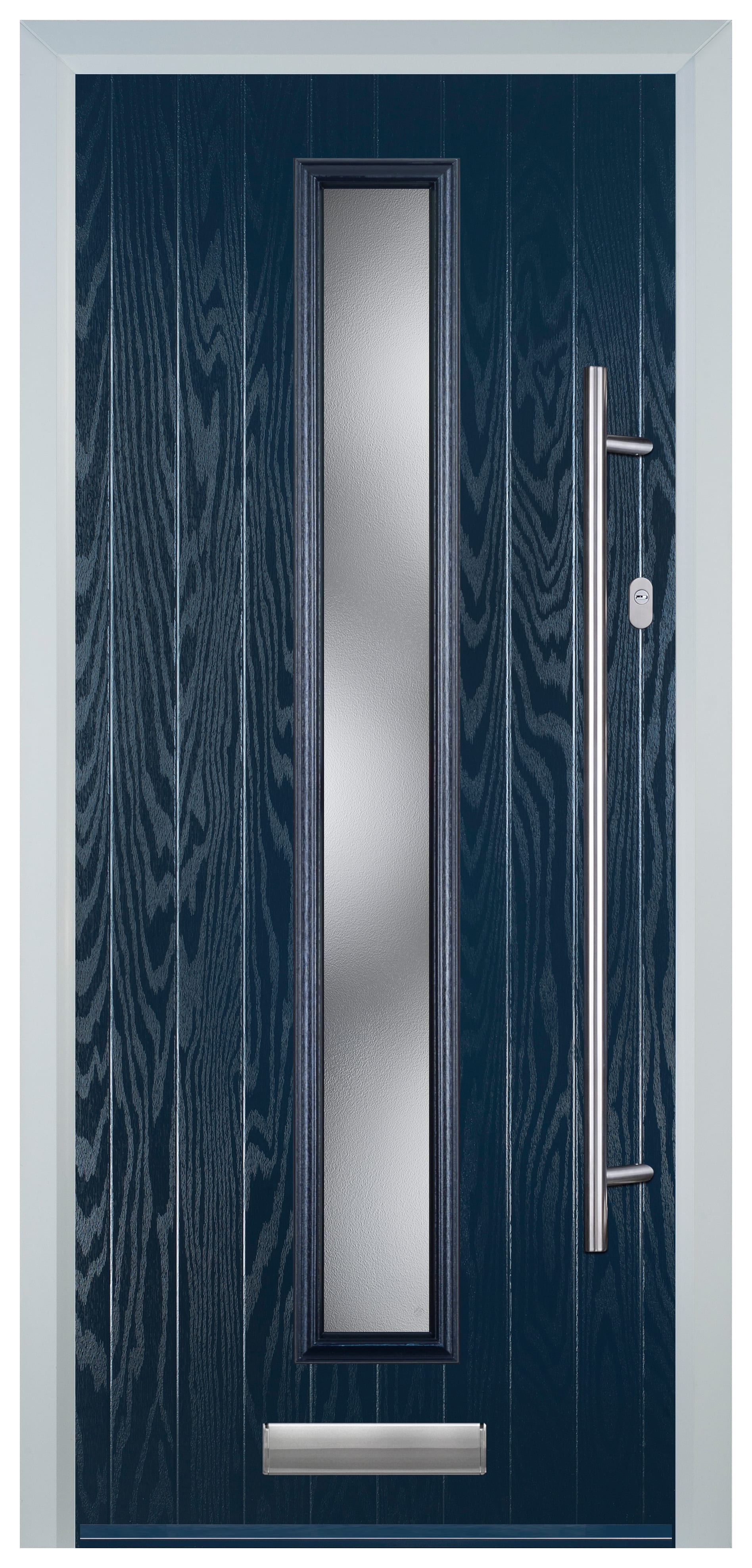 - Door leaf design features a blue external and white internal GRP skin colour, and a long narrow glazing panel in a stippolyte glass pattern