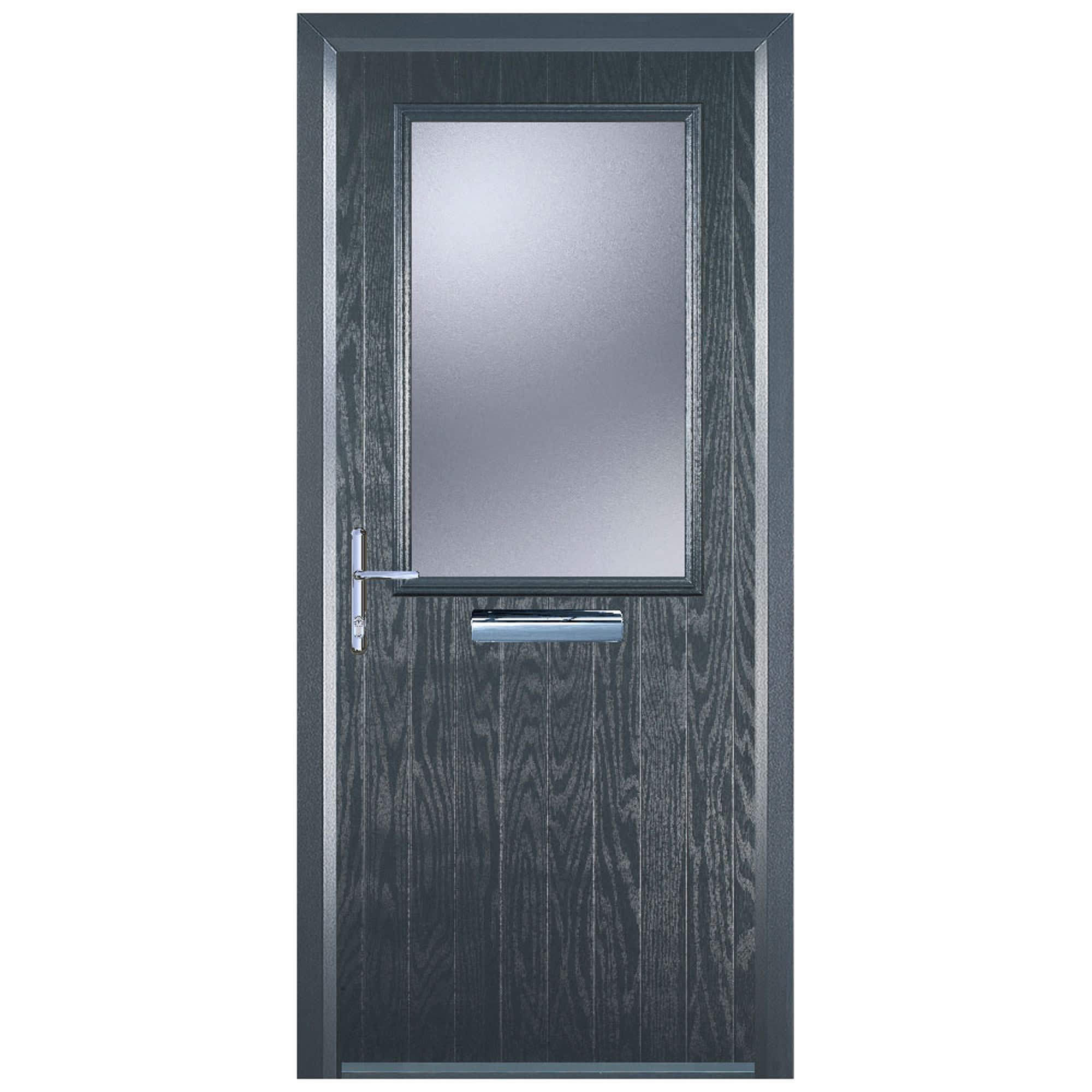 - Door leaf design features an anthracite grey external and white internal GRP skin colour, and a glass panel in a stippolyte glass pattern