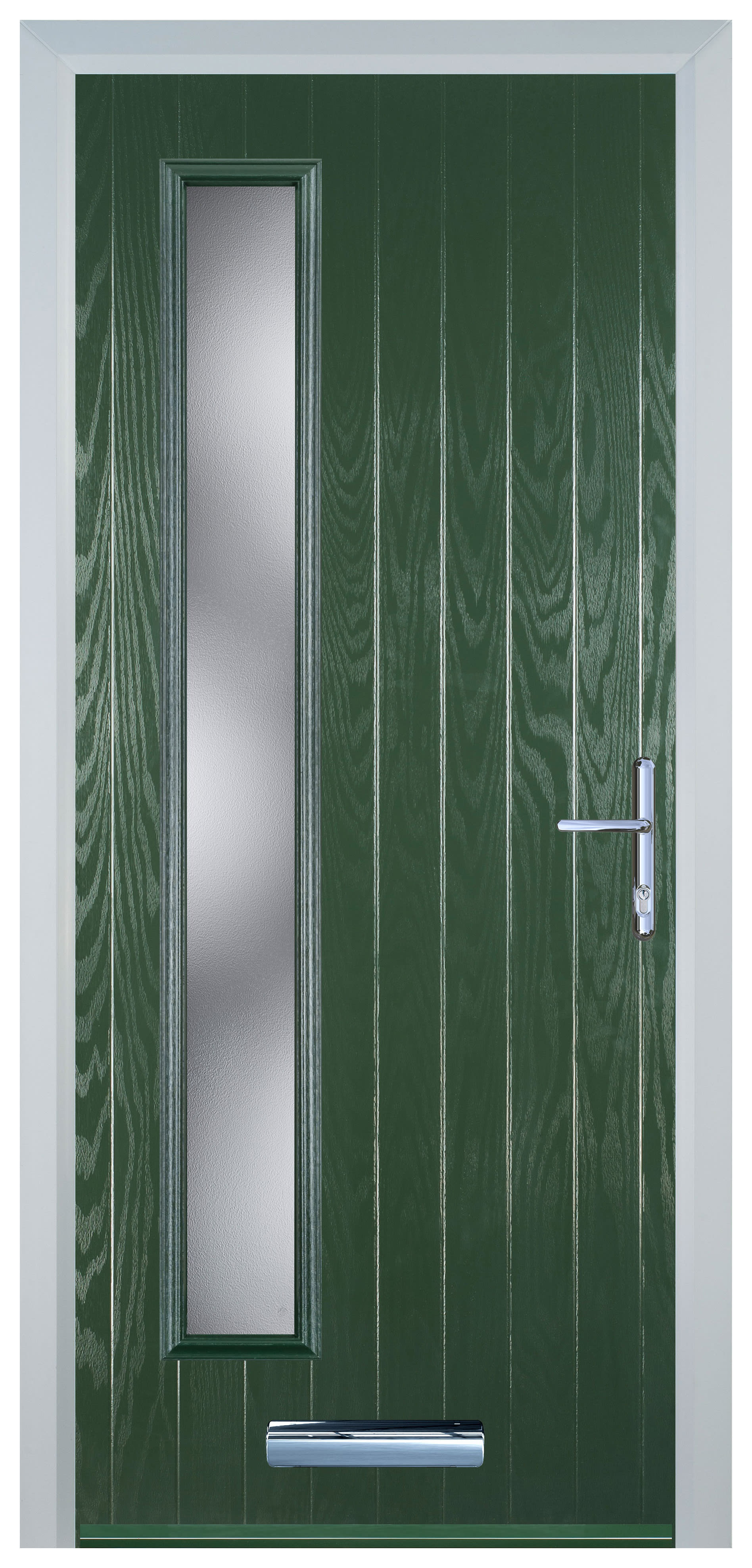 - Door leaf design features a green external and white internal GRP skin colour, and a single, long glass panel in a stippolyte glass pattern