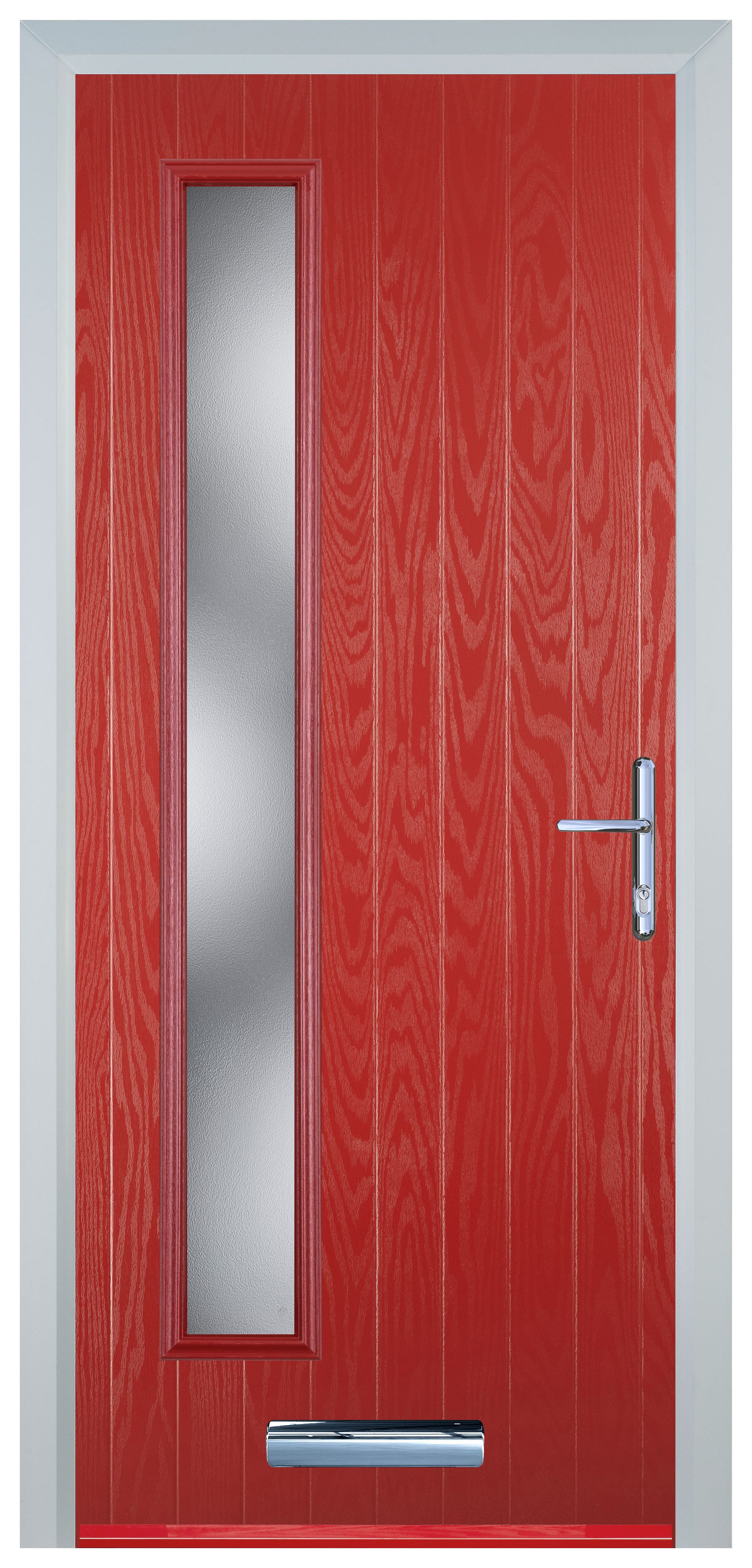- Door leaf design features a red external and white internal GRP skin colour, and a single, long glass panel in a stippolyte glass pattern