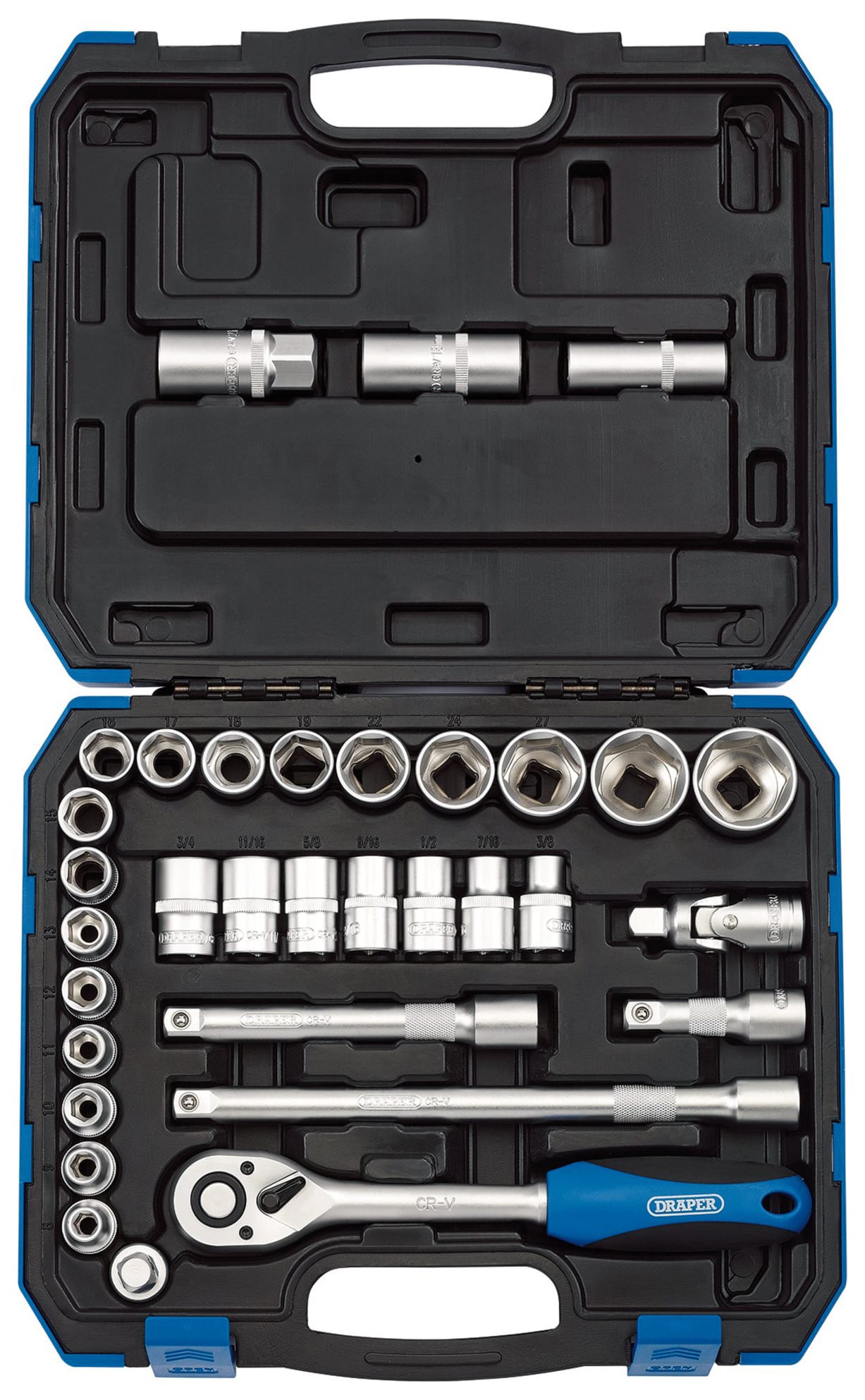 The Draper 1/2" Square Drive Combined MM / AF Socket Set is a six point socket made from chrome vanadium steel that's hardened and tempered with a satin finish. Supplied with a 72 tooth reversible soft grip ratchet and accessories. Packed in a plastic storage case.