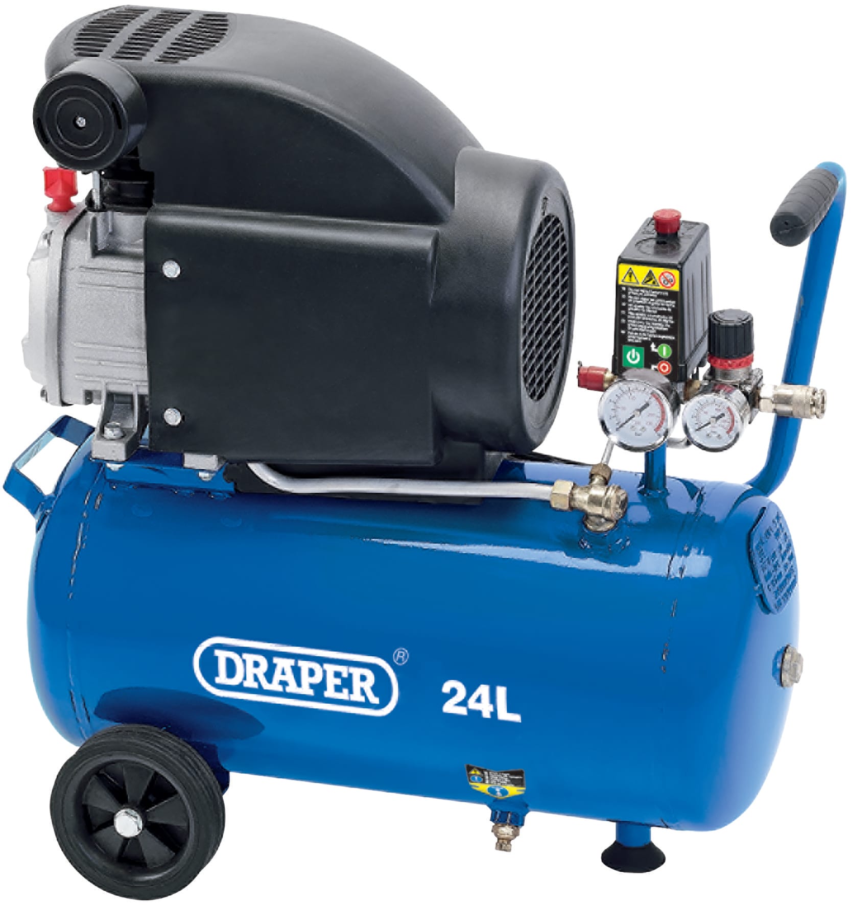The Draper DA25/207 24L Air Compressor is a combination of power and portability. It provides a good volume output for general use it comes with thermal motor protection overload, on/off pressure switch, pressure regulator and pressure gauge, quick euro coupling outlet, wheels and transport handle.