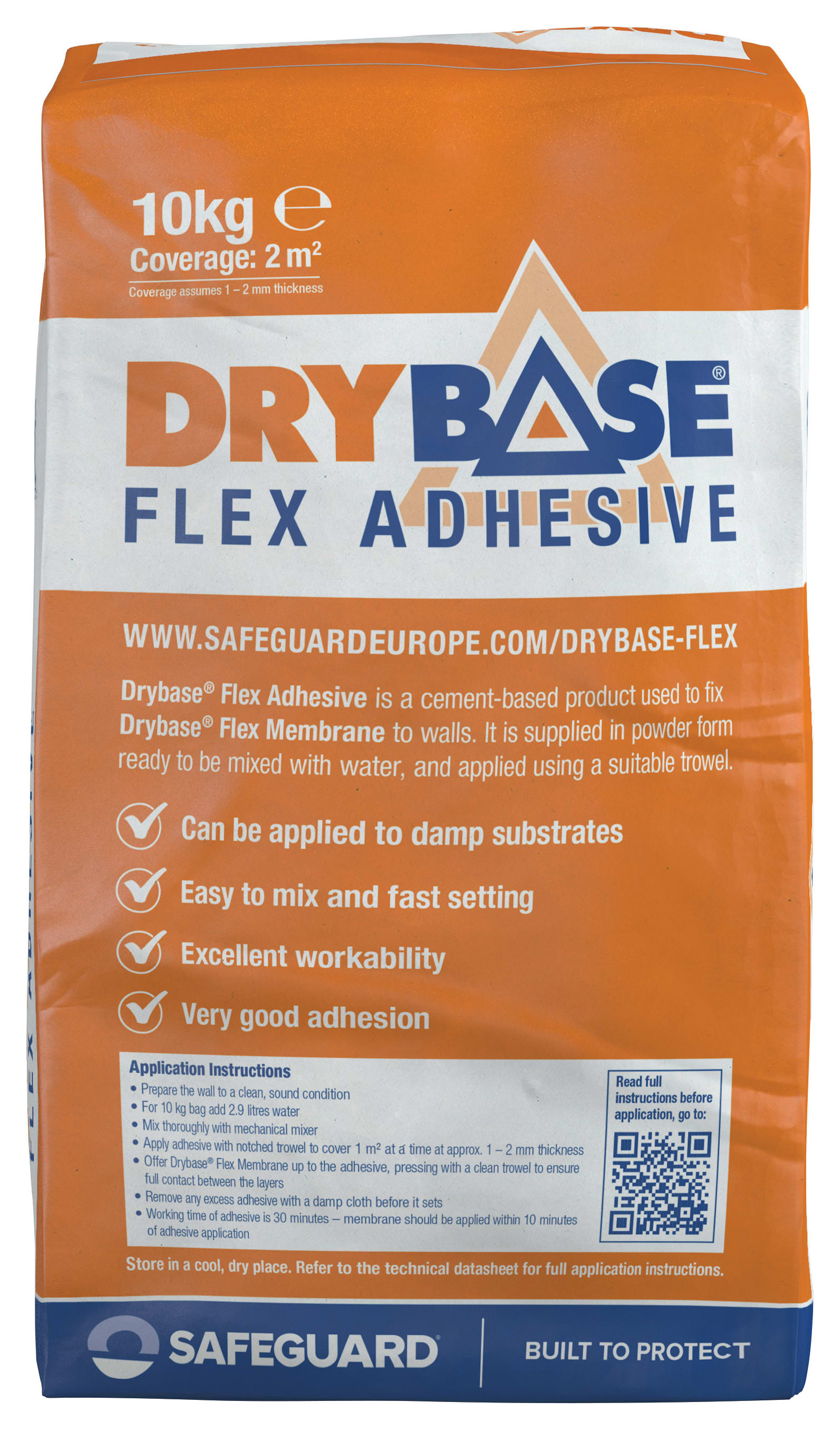 The Drybase Flex Adhesive is a cement-based product used to fix Drybase flex membrane to walls. It is supplied in powder form ready to be mixed with water, and applied using a suitable trowel.