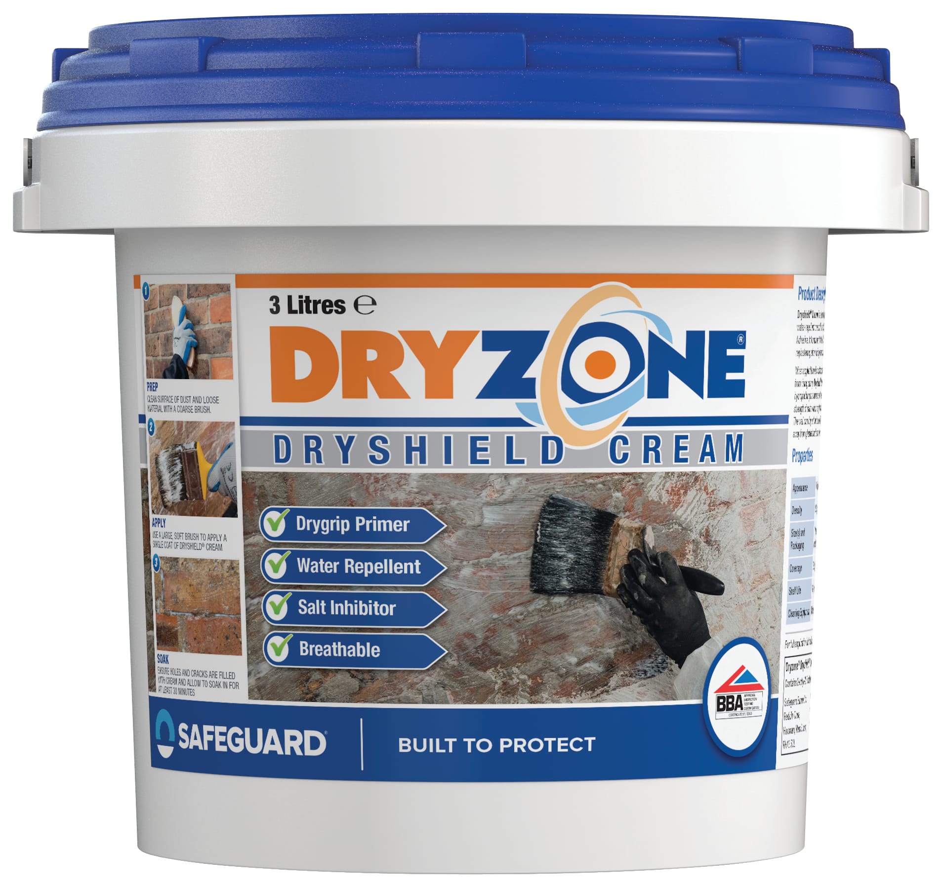 The Dryshield Cream is a breathable, salt-resistant and water-repellent cream that acts as a primer for Drygrip Adhesive. It forms part of the Dryzone System for faster replastering after rising damp treatment. When applied to walls contaminated with groundwater salts from rising damp, Dryshield Cream functions by hydrophobing the surface and weakening the crystallisation strength of salts which may form in or at the masonry surface. The wall can dry out and potentially damaging salts are kept away from plasterboard and other decorative finishes.