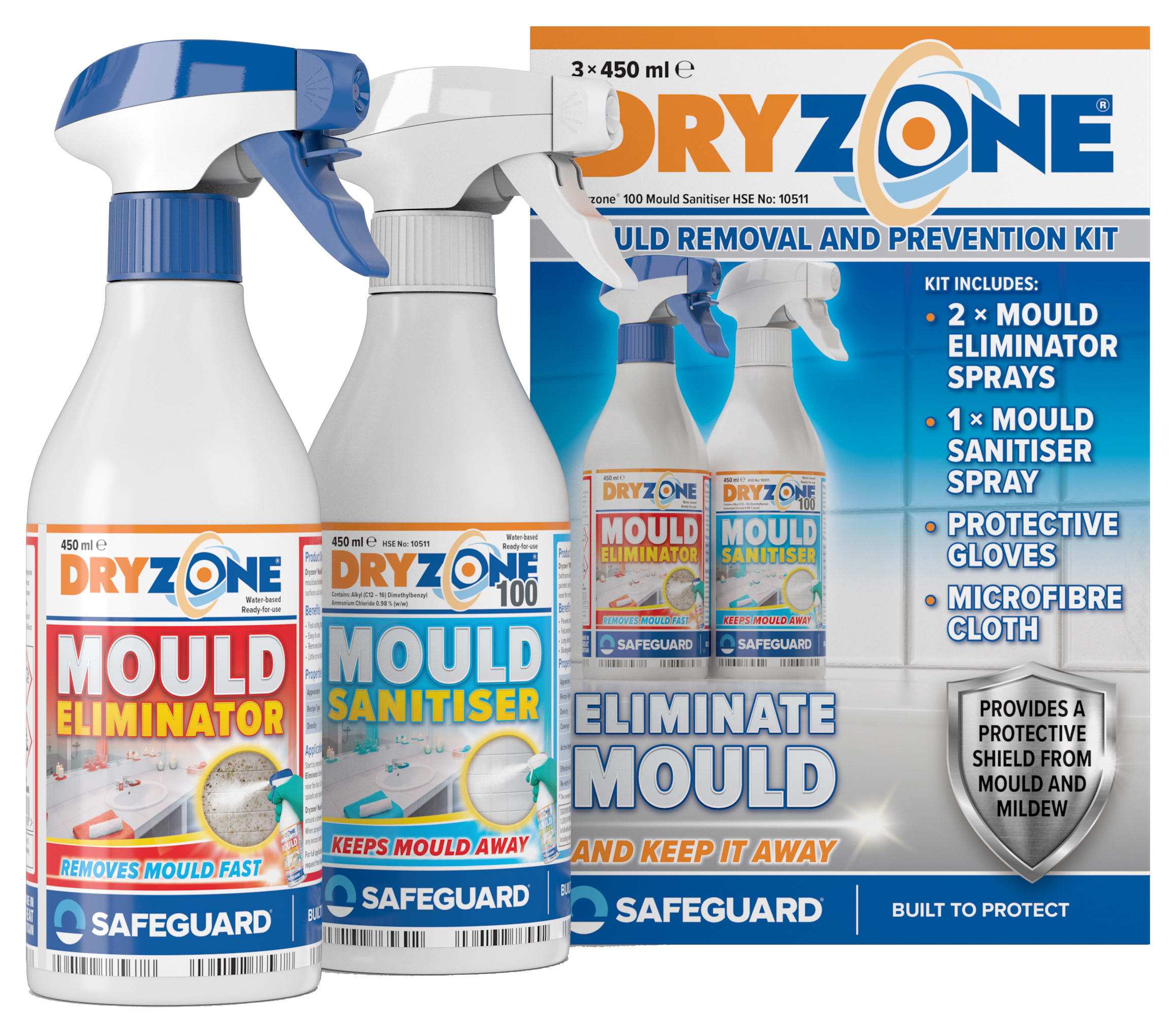 - The kit includes: 2 x dryzone mould eliminator 450ml spray bottles, 1 x dryzone 100 mould sanitiser 450ml spray bottle, 1 x microfibre cloth, 1 x pair of protective rubber gloves