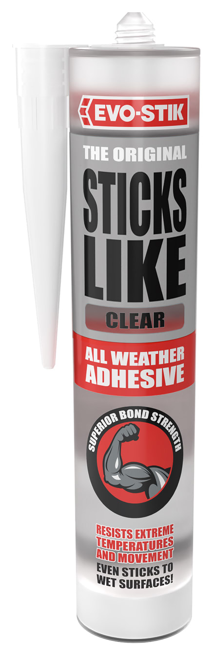 EVO-STIK Sticks Like adhesive in clear is a high performance, all weather, instant grab adhesive that can be used on almost all building materials, even in the wet. The single component, SM Polymer formulation has a superior bond strength, sticking to surfaces even if both are impervious. Plus, Sticks Like Clear is both waterproof and water-resistant, making it ideal for interior and exterior use. Our Sticks Like Clear adhesive is unaffected by extreme temperatures and movement. It also has a very low odour, thanks to its solvent-free formulation. Suitable for fixing onto wood, metal, glass, stone, plastics, polystyrene, concrete, tiles, mirrors, plasterboard and more.