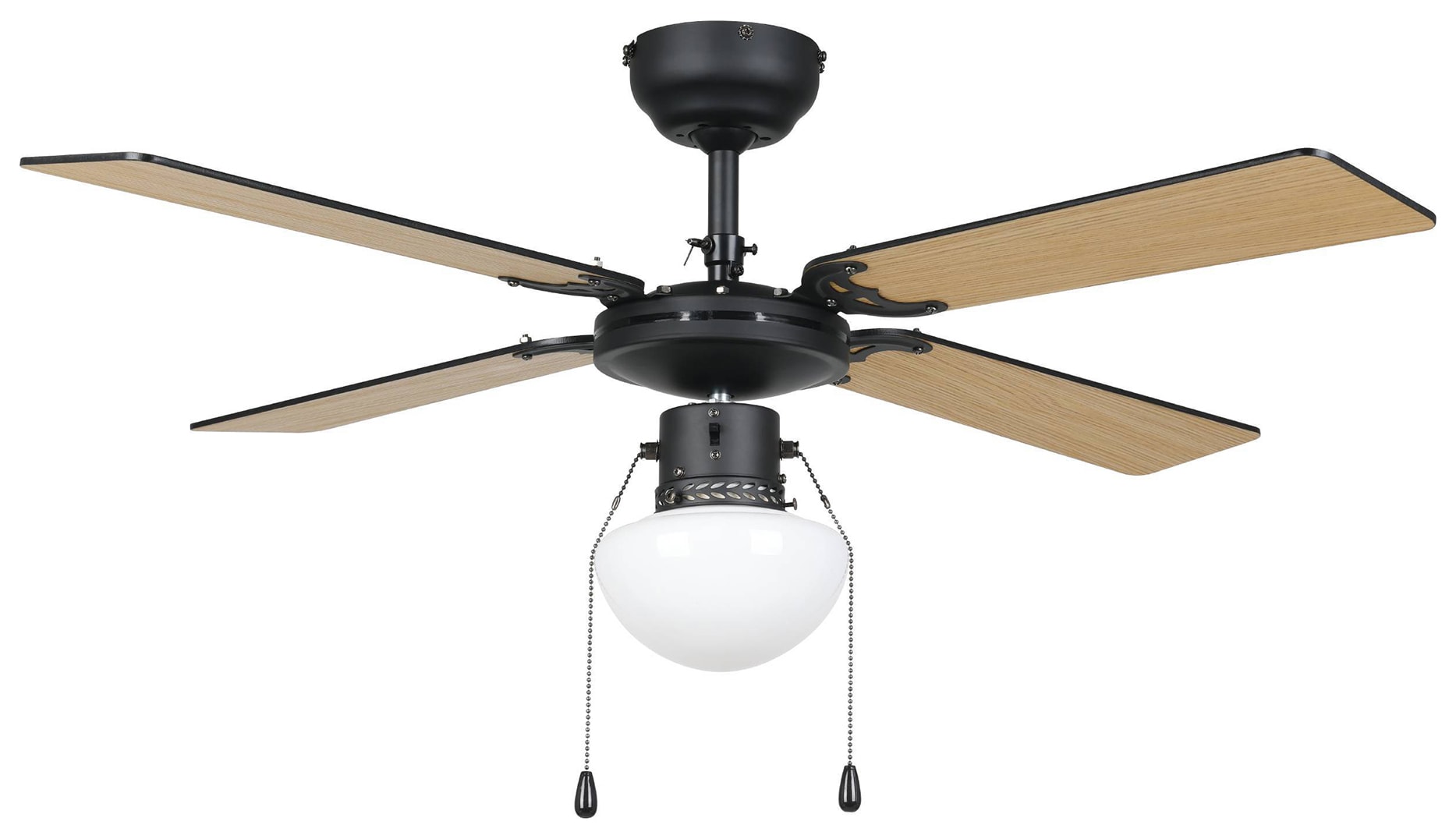 The Eglo Fortaleza ceiling fan features a classic design with a steel structure in a matt black finish and has four reversible blades so that either the wooden effect or the black side is visible. This multifunctional ceiling fan has an E27 lamp holder, allowing you to circulate the air and illuminate a room at the same time. The light source is enclosed by a white-coated glass shade which produces a welcoming glow once the product is on. The ceiling fan's traditional style blends seamlessly into any interior space, fitting perfectly into the living room or bedroom. The product requires 1 x E27 lightbulb, which is not included.