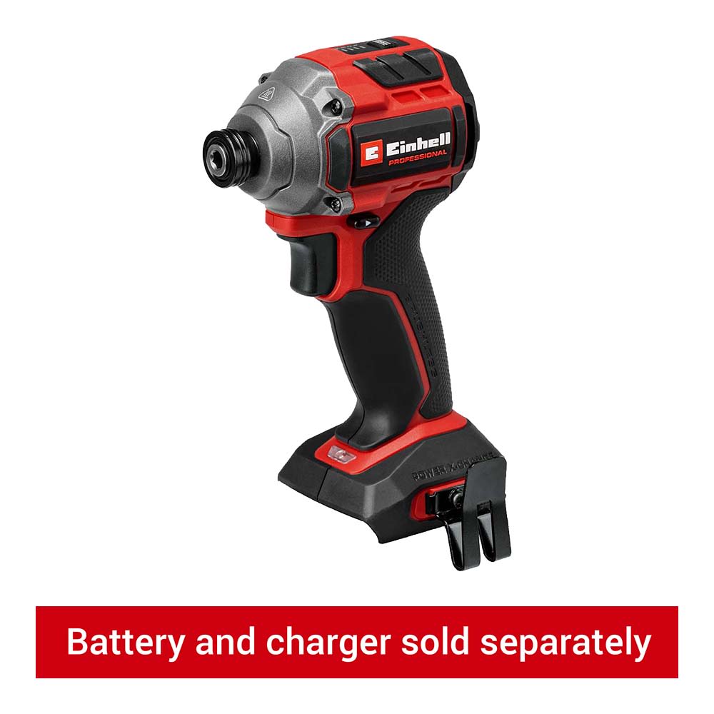 Einhell Power X-Change 18V Cordless Brushless 250Nm Compact Impact Driver is a powerful member of our Power X-Change family. This tool offers more power and longer running times than a conventional carbon brush motor. With its powerful impact mechanism, screwing in large and long screws is the easiest thing for this screwdriver to handle. This professional impact wrench features a ?” (6.35mm) internal hexagon chuck and provides a max. 250Nm of torque level. Torque level and speed can be perfectly adapted to the respective material across three settings. In particular, this makes for gentle handling of soft and delicate materials. For optimum visibility of your working area, the screwdriver has an integrated LED light. To have both hands free while working, a belt clip is provided for easy storage of your cordless tool on your belt.