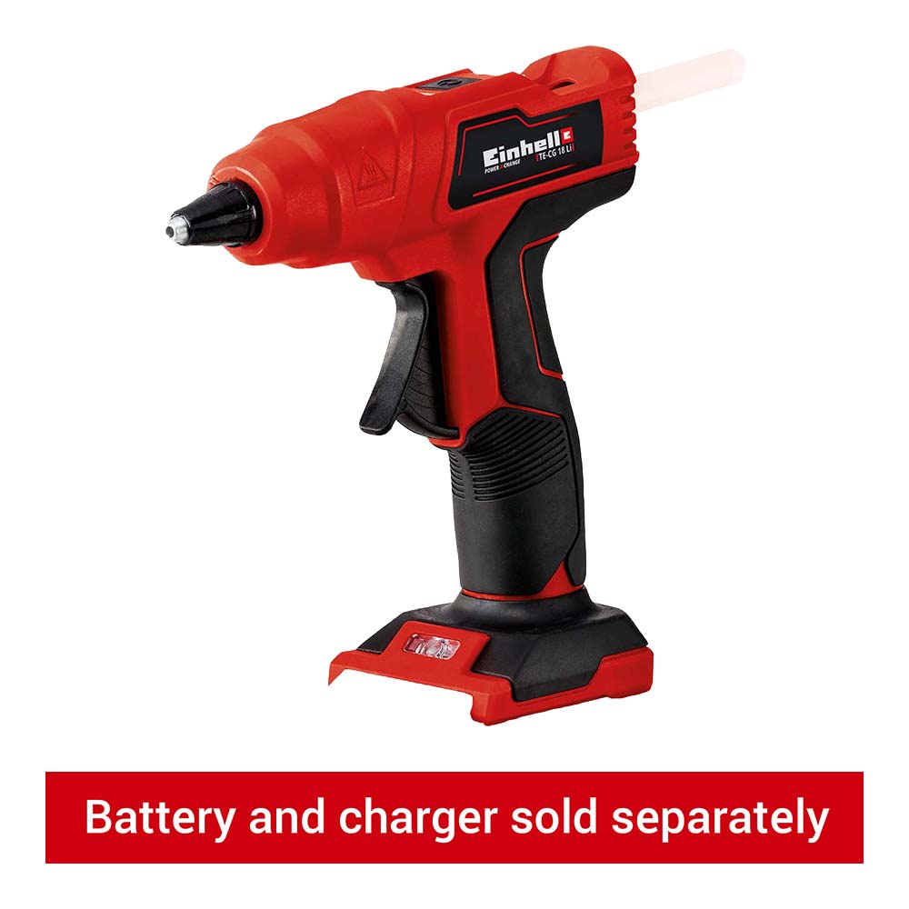 The Einhell TE-CG 18 Li-Solo Cordless Hot Glue Gun is the ideal helper for craftsmen and DIY enthusiasts in the workshed and hobby room for performing precise glueing jobs, filling cracks and gaps and even for sealing fractures and hairline cracks. As a member of the Power X-Change family from Einhell, the glue gun is powered by a high-performance and long-lasting lithium-ion rechargeable battery. This handy glue gun is ready for gluing after only a 120-second warm-up. The practical LED display shows the heat status at-a-glance. The glue gun switches off automatically after 5 minutes without being used to prevent overheating of the glue and the risk involved. The additional flat glue nozzle is ideal for jobs with specific requirements in narrow spaces, for example thin fractures or flat edges. For safe and comfortable handling the cordless hot glue gun has a softgrip. The cordless hot glue gun is supplied complete with 5 glue sticks (diameter 11mm, length 200mm). Supplied without a battery/charger which is available separately.