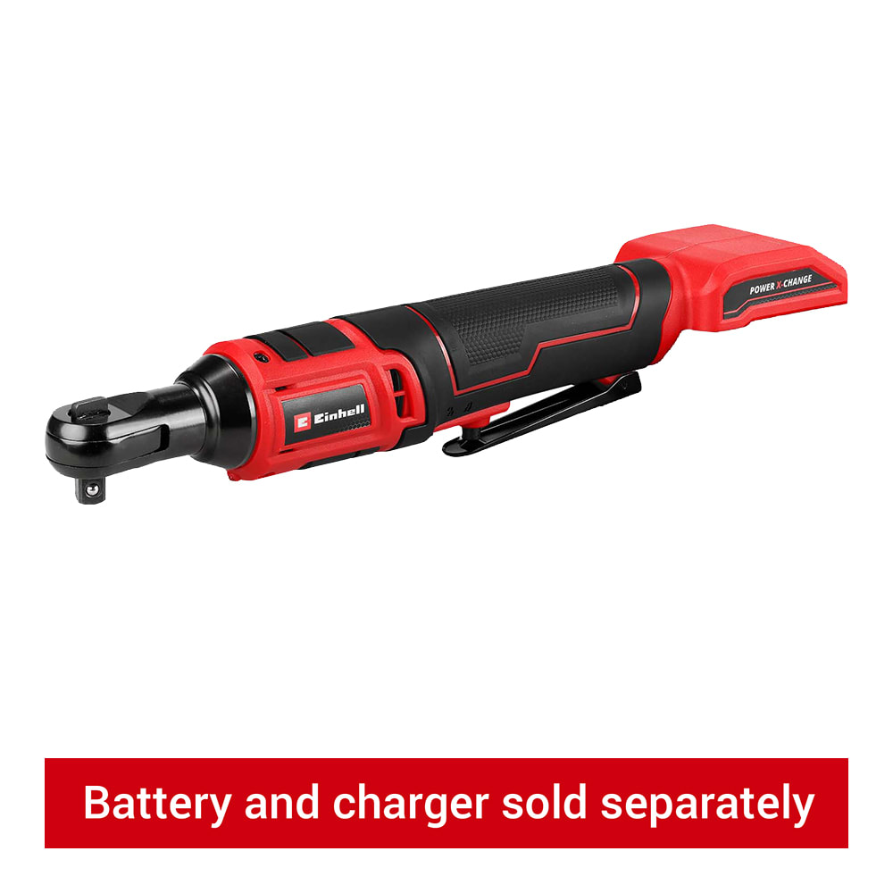 Einhell Power X-Change 18V Ratchet Wrench is a powerful yet mobile companion in the workshop and garage. Compact and equipped with ergonomically designed softgrip surfaces, the ratchet wrench is ideally suited for working in narrow or hard-to-reach areas. In addition, the battery socket can also be used as a hand ratchet. With its robust 3/8" tool holder and high torque of 60Nm, the ratchet wrench can loosen and tighten even tighter screws. Switching from clockwise to counterclockwise is easy with a switch, and the continuously variable speed electronics enables the user to work according to the application. The large-area switch allows operation from different grip positions. The cordless ratchet wrench is equipped with an integrated LED light so that it can also be used in dark areas and includes an adapter to a 1/2" tool holder. Battery and fast charger kit are sold separately (product code 257481).