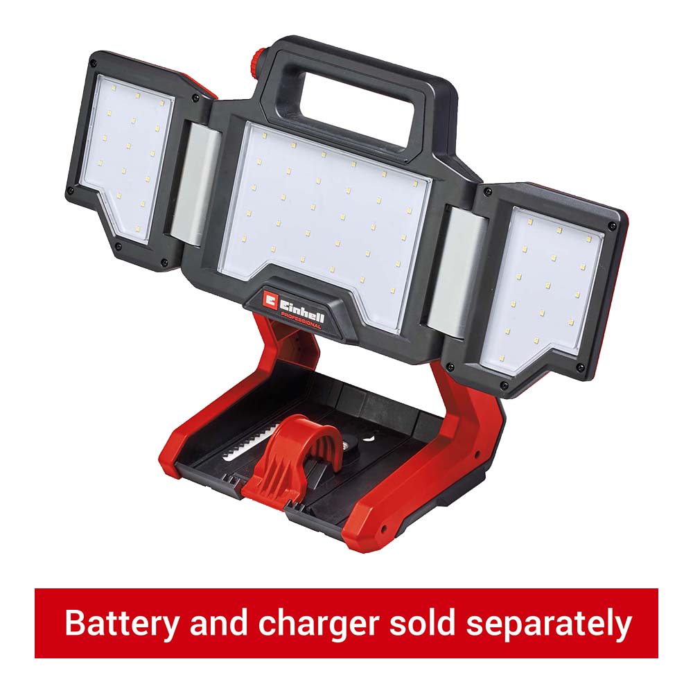 Einhell Power X-Change Cordless Professional Site Work Light brings light into the dark, whether on the construction site or in the workshop, garage or garden. A powerful lithium-ion battery from the innovative Power X-Change family ensures an optimal light level. A total of 60 powerful and dimmable LEDs produce up to 3000 lumens to ensure optimal illumination at all angles and in every corner. It is highly versatile thanks to its swivelling light head and the two light panels on the left and right can be adjusted to provide illumination of large areas spanning up to 270°. The neutral-white light temperature of 5700K ensures bright lighting conditions. The numerous mounting options including integrated eyelets and a fastening hook mean there are no limits to using it anywhere. Battery and fast charger kit are sold separately (product code 257481).