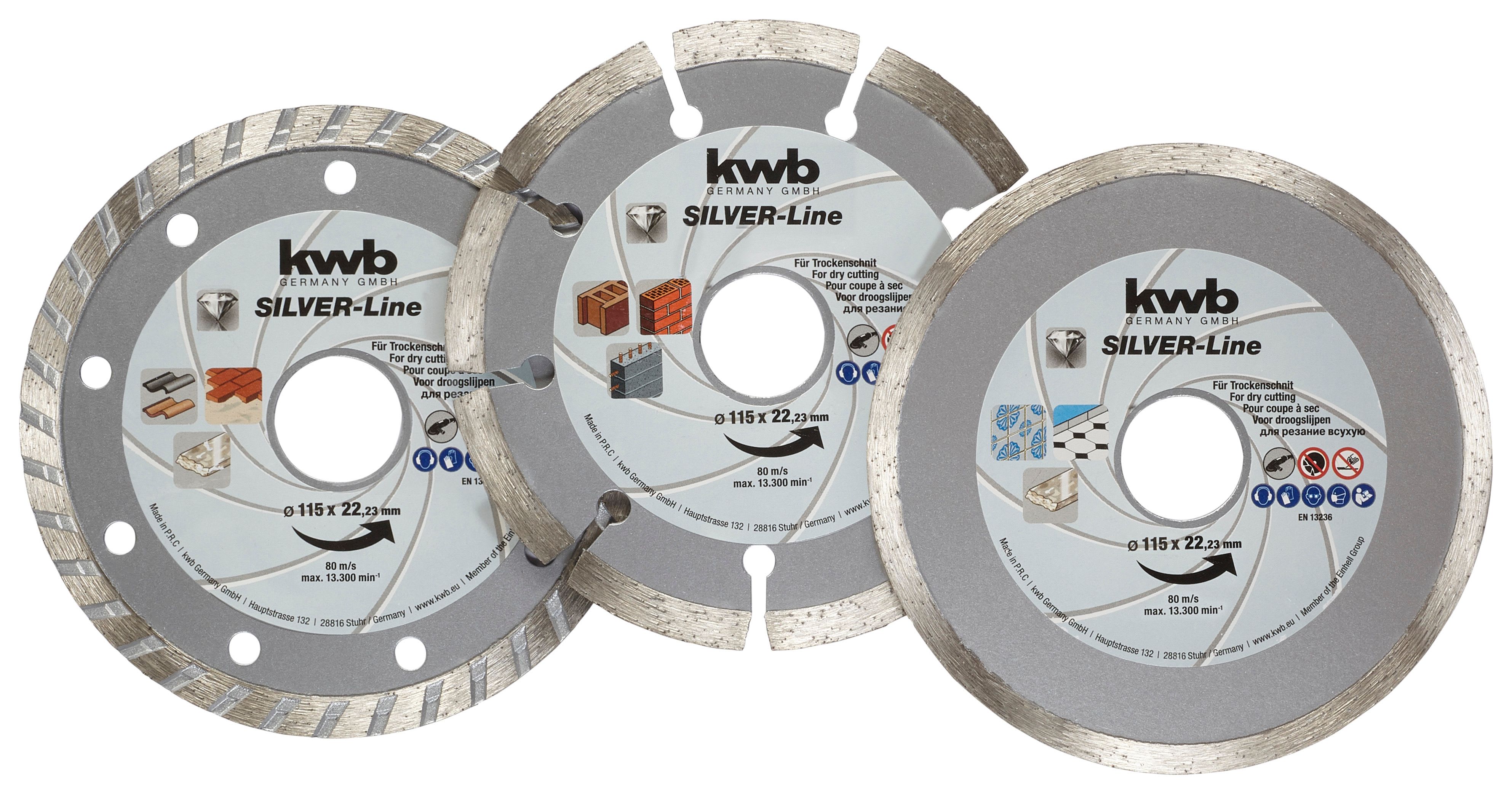 The Einhell KWB 3 Pack Diamond cutting discs 115mm are high quality diamond blades which ensures fast cutting and longer life. Suitable for hollow blocks, concrete roof tiles & ceramic materials like tiles. The laser welded, closed cutting edge of 7 mm thickness is great for hollow blocks, roof tiles made of concrete, ceramic materials, tiles; segmented cutting edge, 7 mm thickness, for bricks, concrete blocks, clinker bricks. The closed edge 5 mm thickness is ideal for finer cutting for tiles, ceramic, travertine, these blades for all standard angle grinders with 80 m/s circumferential speed.