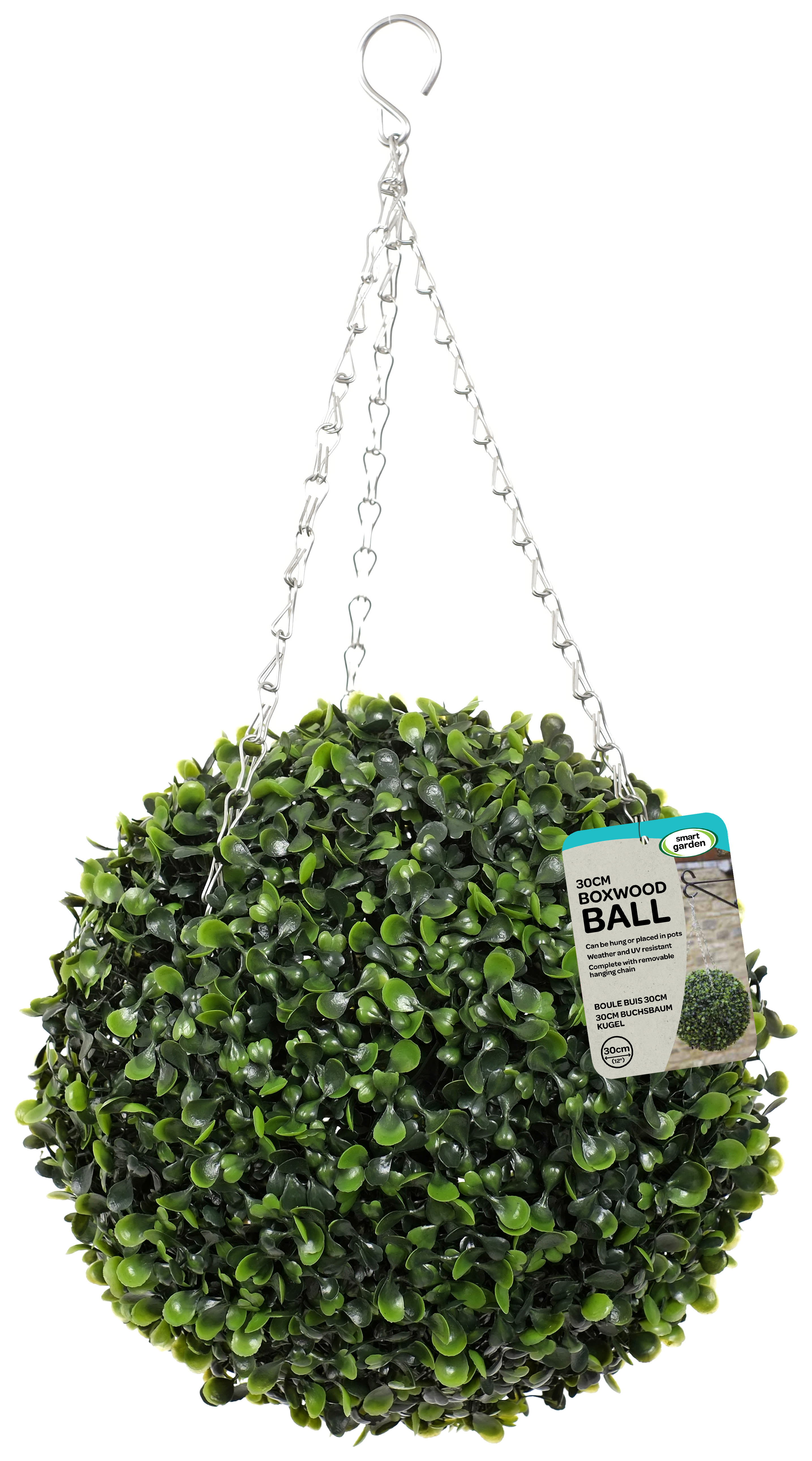 The Faux Boxwood Topiary Ball, with a 30cm diameter, offers an effortless way to enhance outdoor spaces with a sleek, manicured look. Featuring realistic glossy box leaves, this zero-maintenance artificial topiary is weather and UV resistant, ensuring it looks fresh and stylish all year round. It comes with a stainless steel hanging chain, which can be removed if desired, allowing it to be hung or placed in pots for versatile decor options. Perfect for adding an elegant touch to your garden without the upkeep.