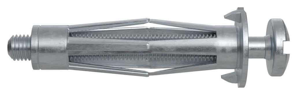 Fischer cavity metal anchor HM-S is a versatile cavity fixing with a metric screw for all panel building materials. The fixing is set with the fischer installation pliers HM-Z 1 in the pre-positioned installation. The fixing is pulled in the cavity against the board building material with the pliers. In this case, the expanding arms swing open and press onto the reverse side of the board.